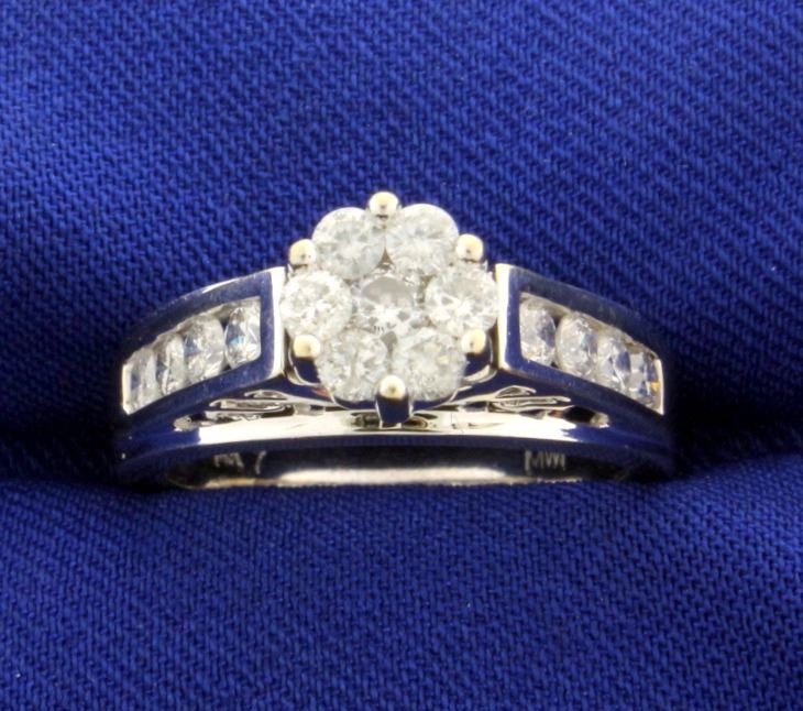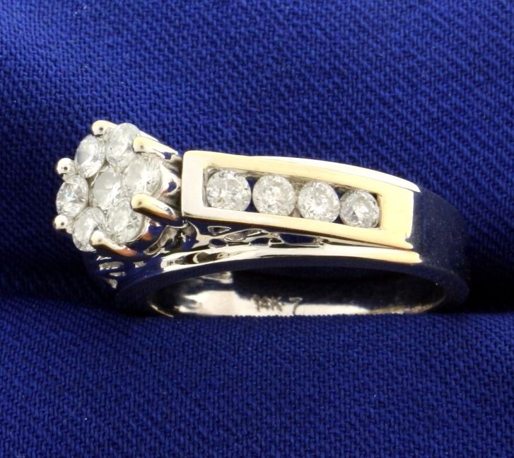 In 14k white gold. Contains 15 high quality .07ct diamonds - SI clarity/H color, great cut with lots of sparkle. Center seven diamonds are invisible set so it looks like one large 1.5 ct diamond. Size 7 1/4. 6.8g.