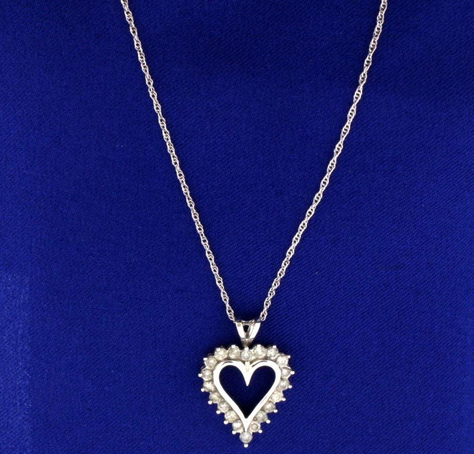 In 10k white gold, containing twenty .05ct diamonds, I color/I clarity. Pendant is 1 inch long and chain is 18 inches long. 3.6g.