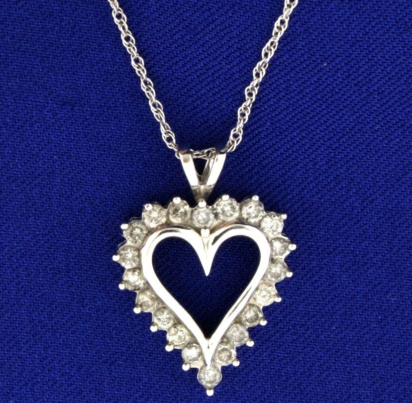 In 10k white gold, containing twenty .05ct diamonds, I color/I clarity. Pendant is 1 inch long and chain is 18 inches long. 3.6g.