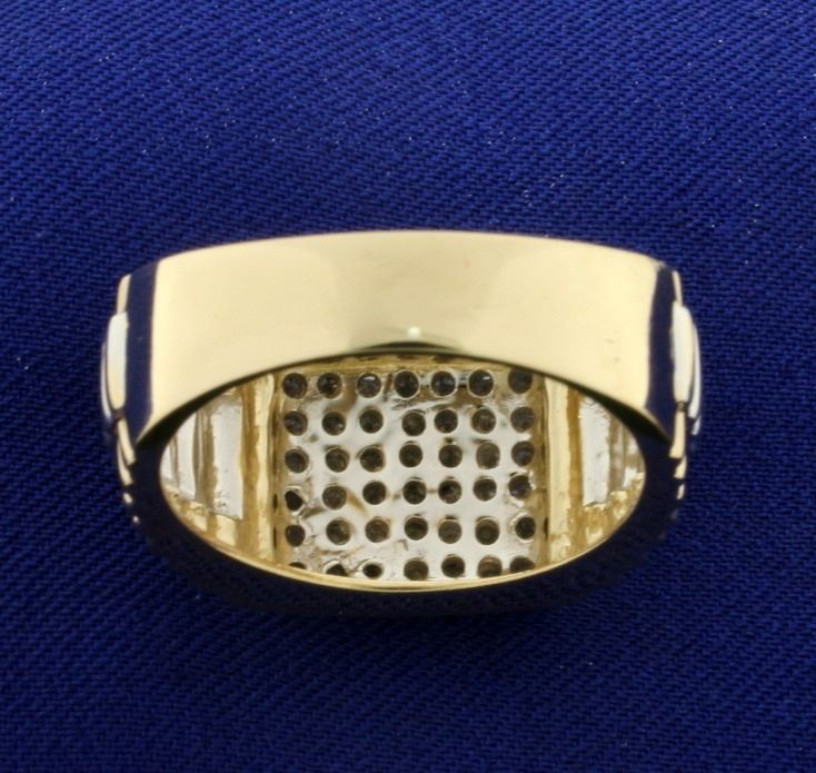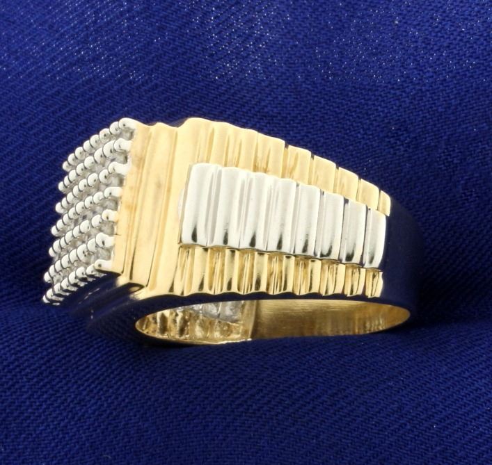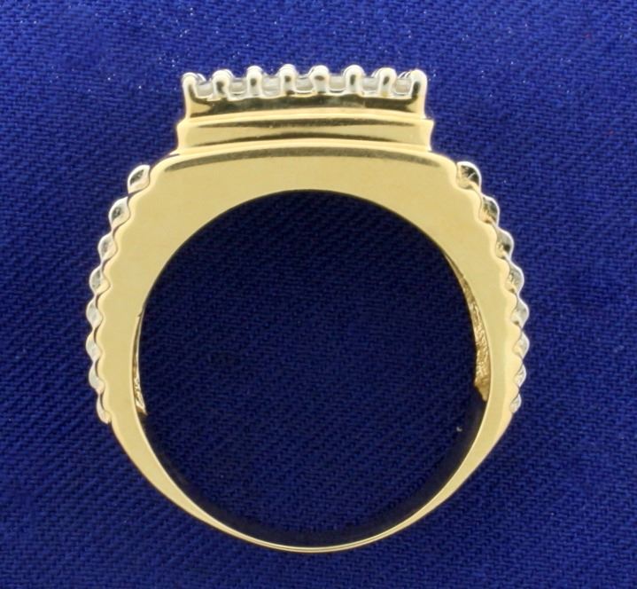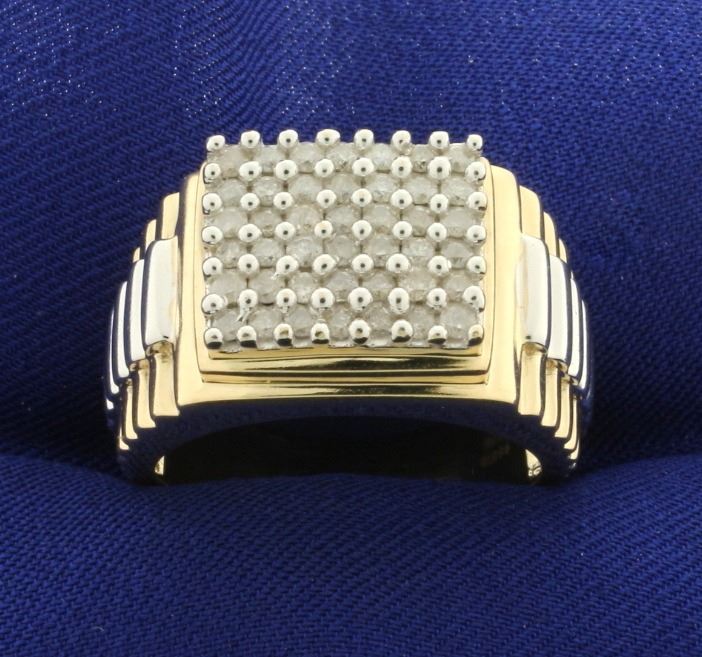 In 9k yellow and white gold. Contains 1ct TW of high quality diamonds, I color/I clarity. Size 12. 11.7g.