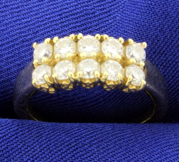 In 18K yellow gold, this ring contains ten .1ct high quality diamonds - all SI clarity, H to I color. Size 7. 5.5g