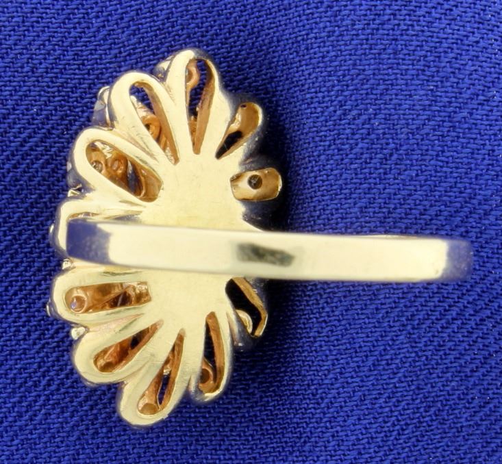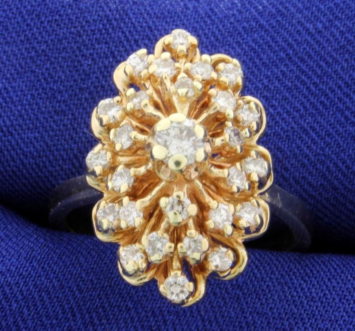 In 14K yellow gold, the center diamond is a high quality 1/4ct SI clarity/H color stone and is surrounded by twenty seven .03ct diamonds of similar quality. Size 9 1/2 10.1g