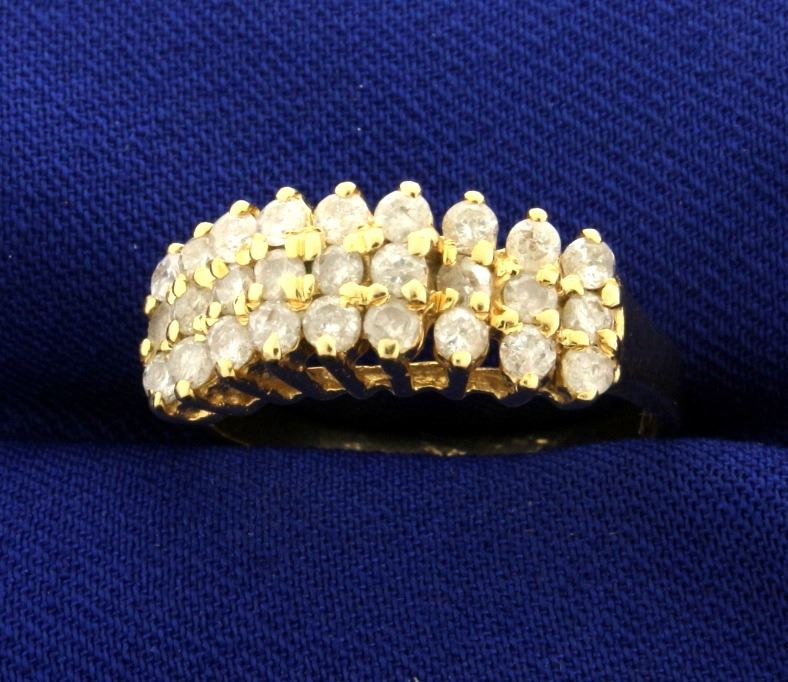 In 14k yellow gold, containing 27 diamonds. I clarity/I color. Size 7 1/2. 4.7g.