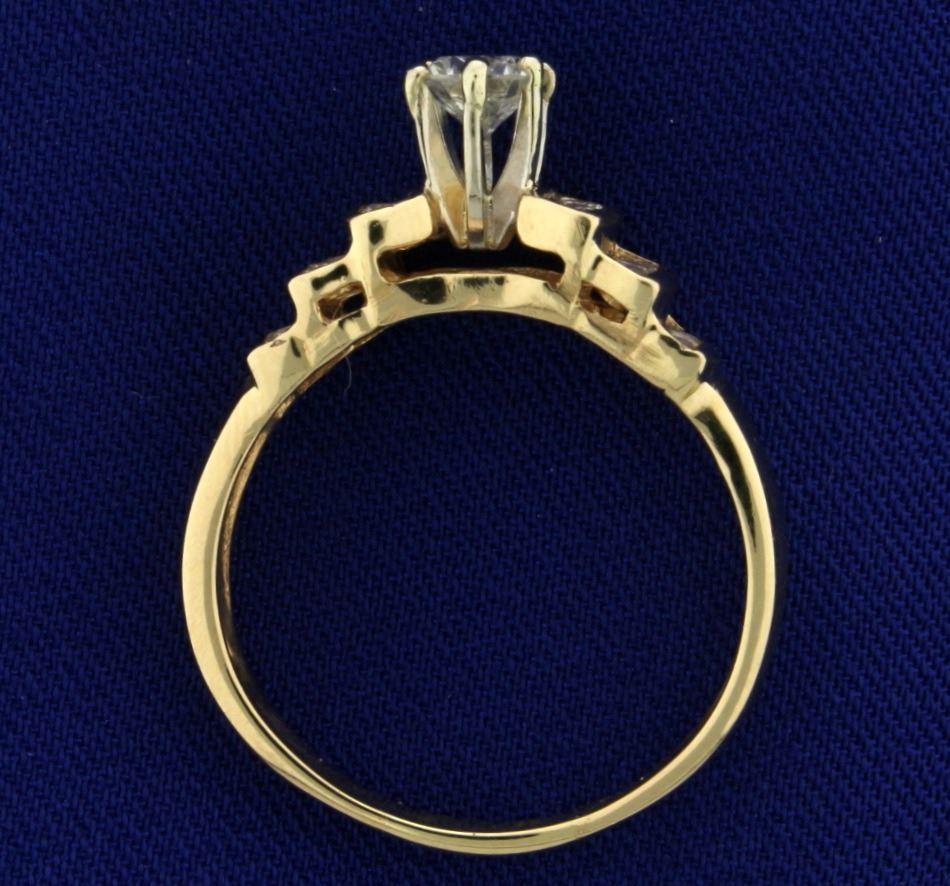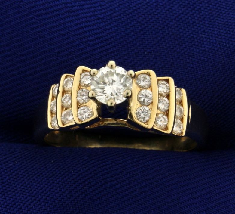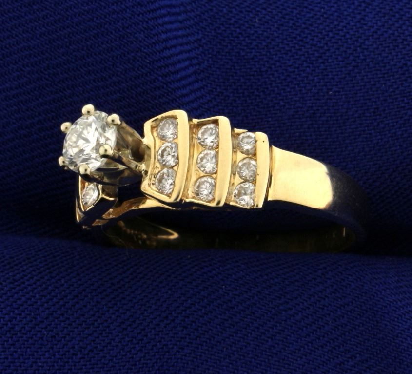 In 14k yellow gold. Center diamond is .45cts surrounded by six .04ct diamonds, six .03cts diamonds, and six .02ct diamonds. All are very high quality diamonds with a VS clarity/G color. Size 10 1/4. 4.9g.