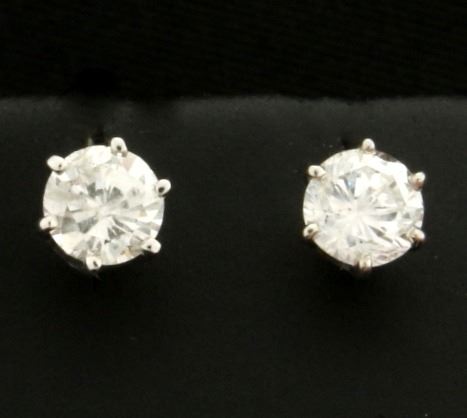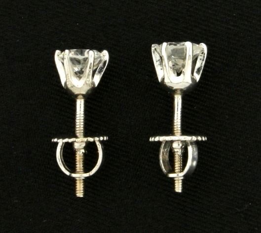 In 14k white gold. Diamonds are high quality SI clarity/F color, very "white", eye clean with lots of sparkle. Set in six prong settings with screw backs for safety. 1.4g.