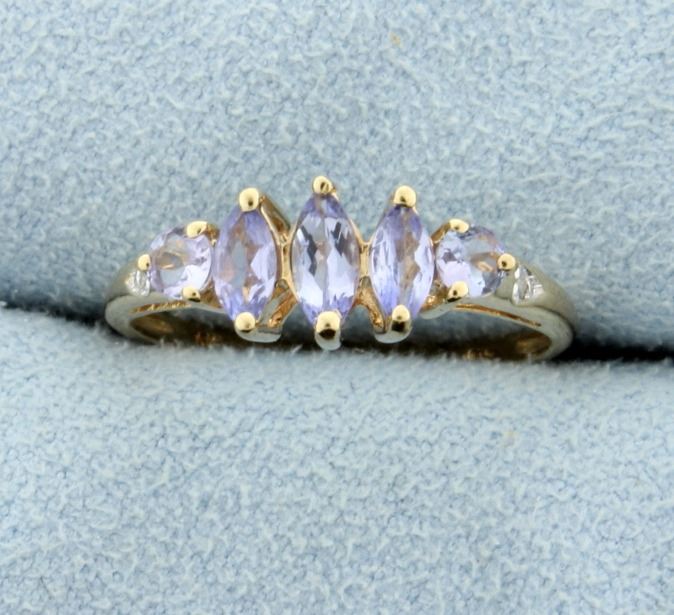 In 10k yellow gold this ring contains marquise & round synthetic tanzanite gemstones. With 2 round 1/2pt natural diamonds. Size 7 1.4g