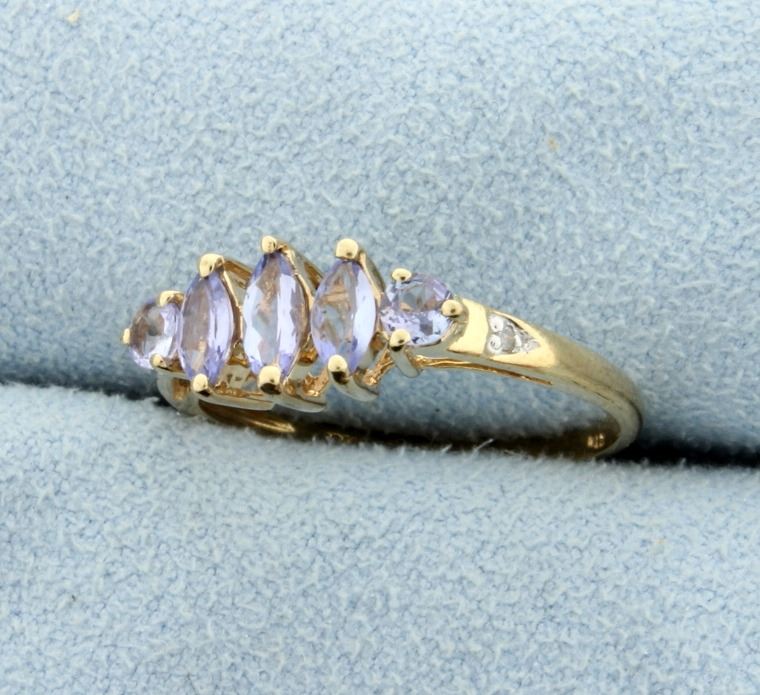 In 10k yellow gold this ring contains marquise & round synthetic tanzanite gemstones. With 2 round 1/2pt natural diamonds. Size 7         1.4g