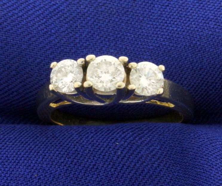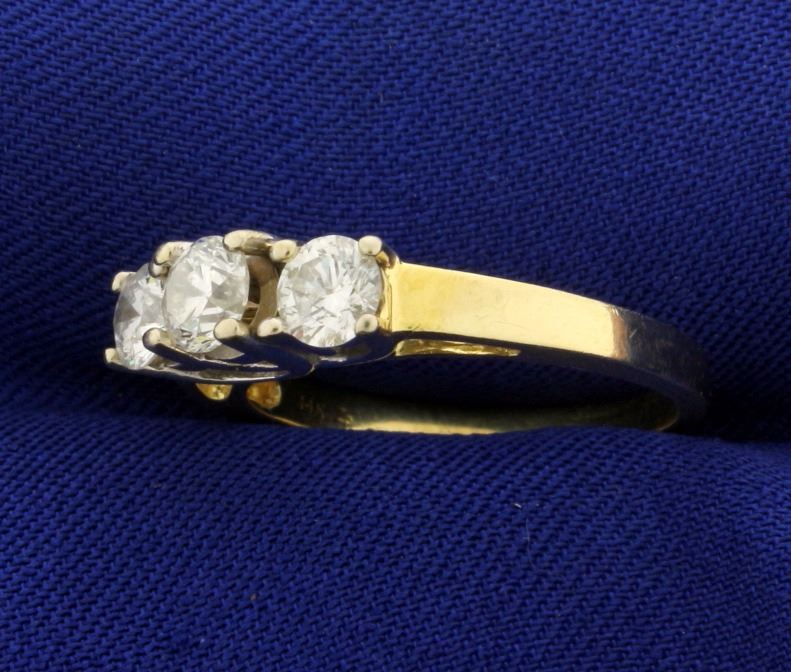 In 14k yellow and white gold, containing a center diamond of .36cts surrounded by two .32ct diamonds. All high quality SI clarity/H color. Size 7 1/4. 4.0g.