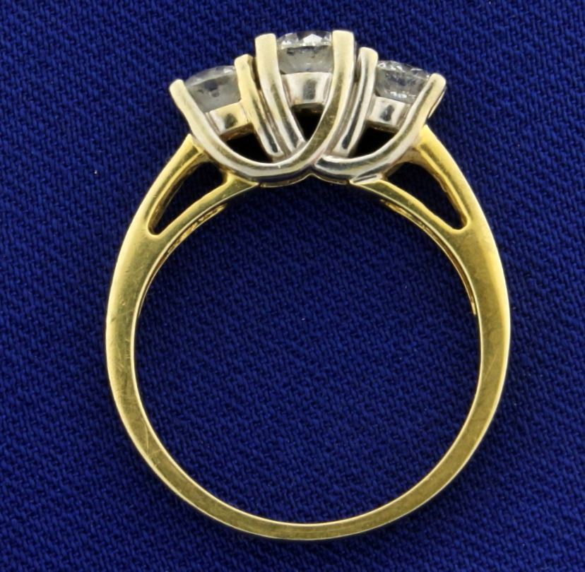 In 14k yellow and white gold, containing a center diamond of .36cts surrounded by two .32ct diamonds. All high quality SI clarity/H color. Size 7 1/4. 4.0g.