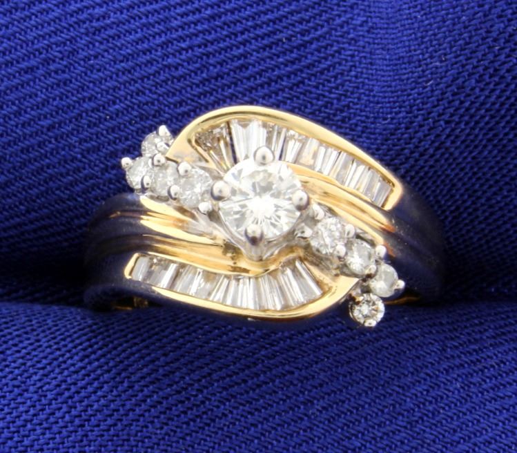 In 14K yellow gold. The center diamond is .3ct and is SI clarity/H color. Surrounded by .2cts of round & .05cts of baguette diamonds, all SI clarity/H color. Size 7 5.9g