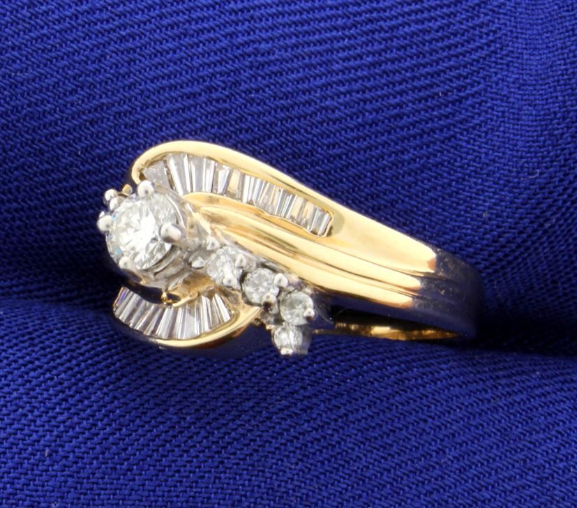 In 14K yellow gold. The center diamond is .3ct and is SI clarity/H color. Surrounded by .2cts of round & .05cts of baguette diamonds, all SI clarity/H color. Size 7 5.9g