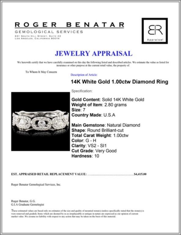 Regarding Appraised Jewelry and Loose Stones - Auctionfarm sends them out to a third party for Retail Replacement Value Appraisals, which are the most common. These types of evaluations are written for insurance needs. This would be the cost to replace the jewelry with an item of equal quality and kind, considered to be the current market price or the replacement value. This type of appraisal is done to protect you in the event of damage or loss of a valuable item. Our appraisals are conducted by independent 3rd Party appraisal firms that utilizes Certified GIA Gemologist. Appraisals should be used for verification of gemstone and/or metal weight, size, and grade only, not actual value. Appraisal value should be considered for insurance purposes only, not actual value, as price varies greatly from retail locations thru out the world. Items should not be purchased with the expectation to resell for appraisal price, or for profit.