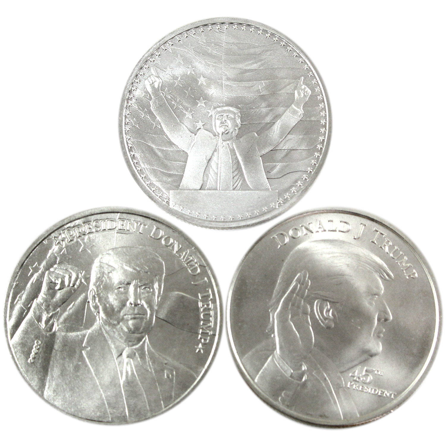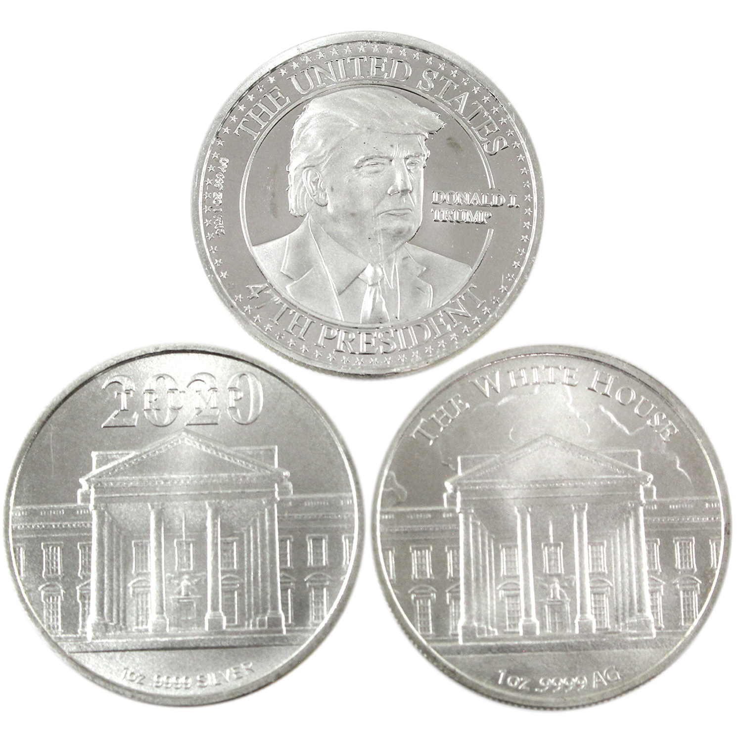 INCLUDES: 2024 47th President .999 silver round, 45th President The White House .9999 silver round, & Trump 2020 .9999 silver round. 3pcs. (Tax Exempt)