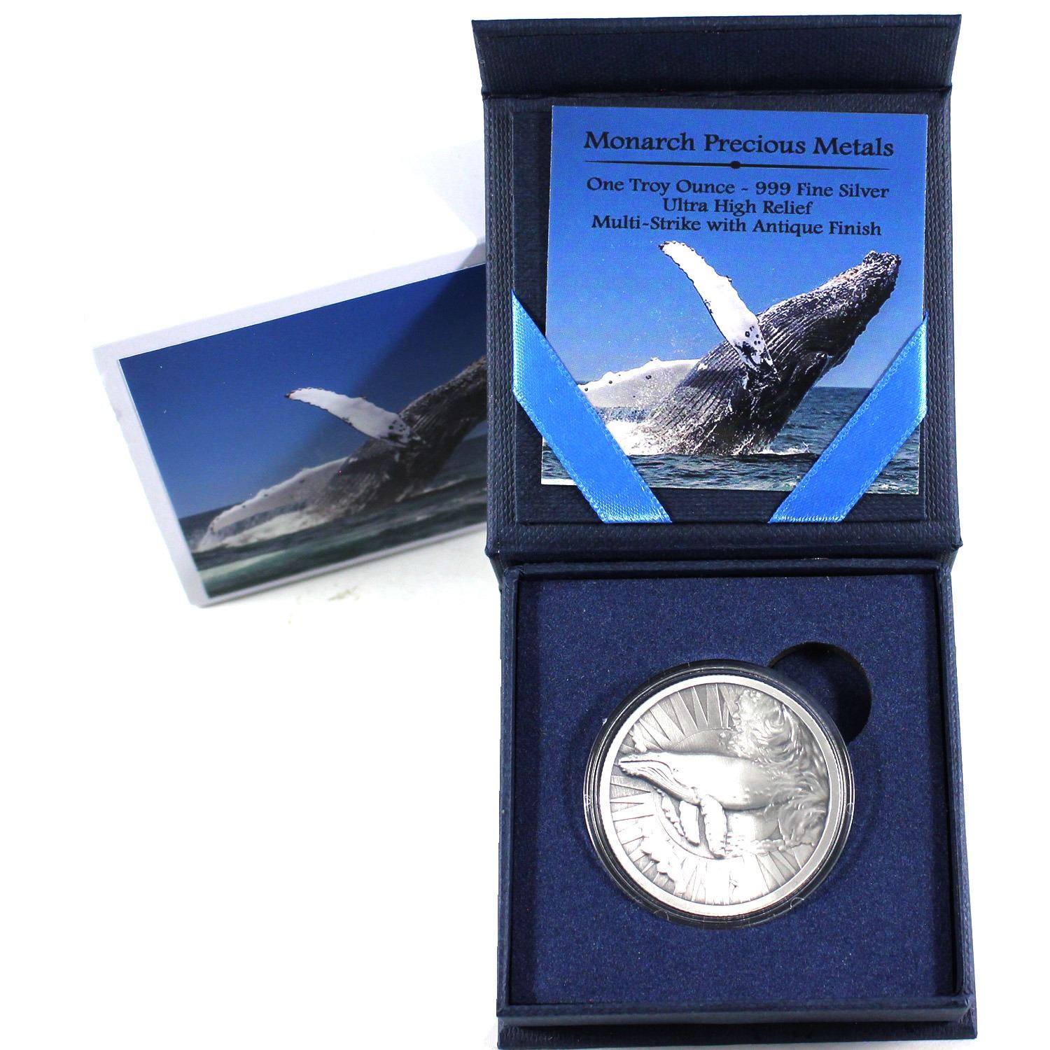 1oz Silver Humpback Whale struck in Ultra High relief and with an Antique Finish. Comes in original Box and capsule. Produced by Monarch Mint. (Tax exempt)