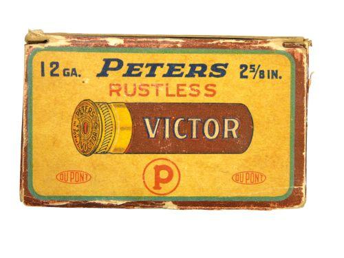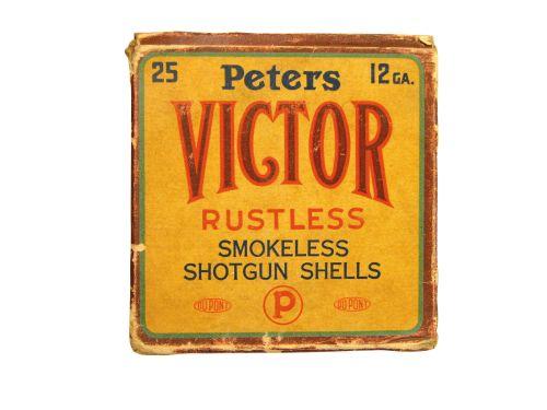 One Piece Peters Shot Shell Box for 12 gauge Victor rustless shells, full of loaded shot gun shells. Excellent condition, complete.