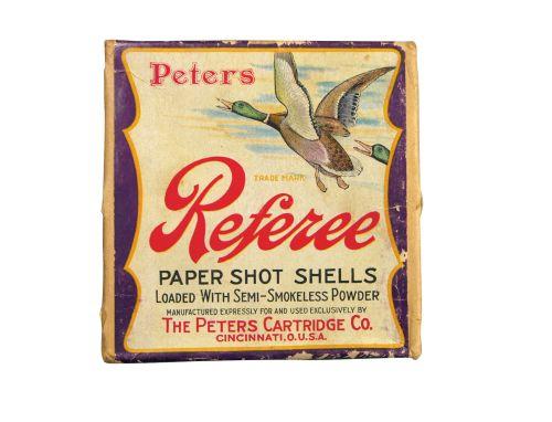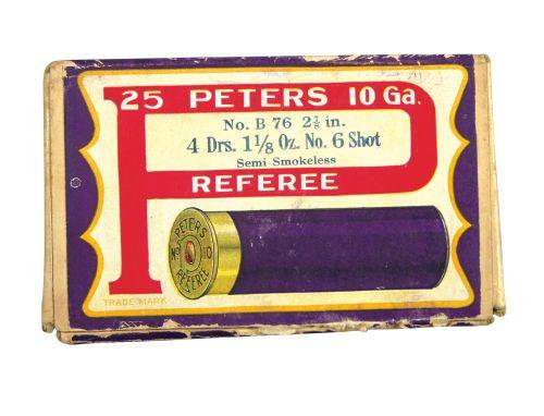 One Piece Peters Shot Shell Box for 10 gauge referee paper shot shells, empty. Excellent condition, complete.