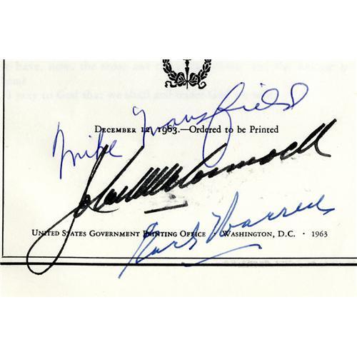 <B> First Congressional Printing of the Eulogies of JFK by Mike Mansfield, John McCormack and Earl Warren</B></I> {John F. Kennedy} Congressional official GPO printed pamphlet headed, 88th Congress,1st Session Senate Document No. 46 John Fitzgerald Kennedy *Eulogies Delivered in the Rotunda of the United States Capitol, November 24, 1963 * Mike Mansfield Senate Majority Leader Earl Warren Chief Justice John W. McCormack Speaker of the House. Signed boldly across the bottom. Possibly a unique Kennedy item.