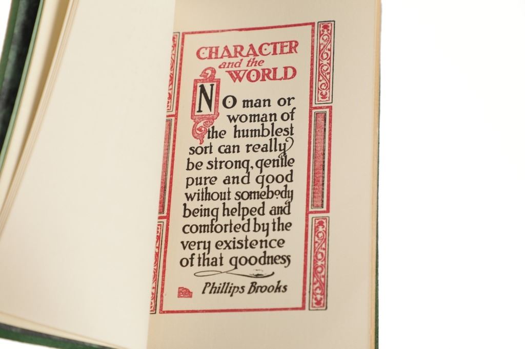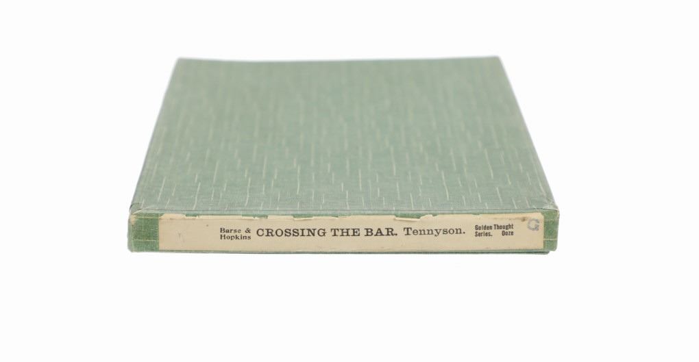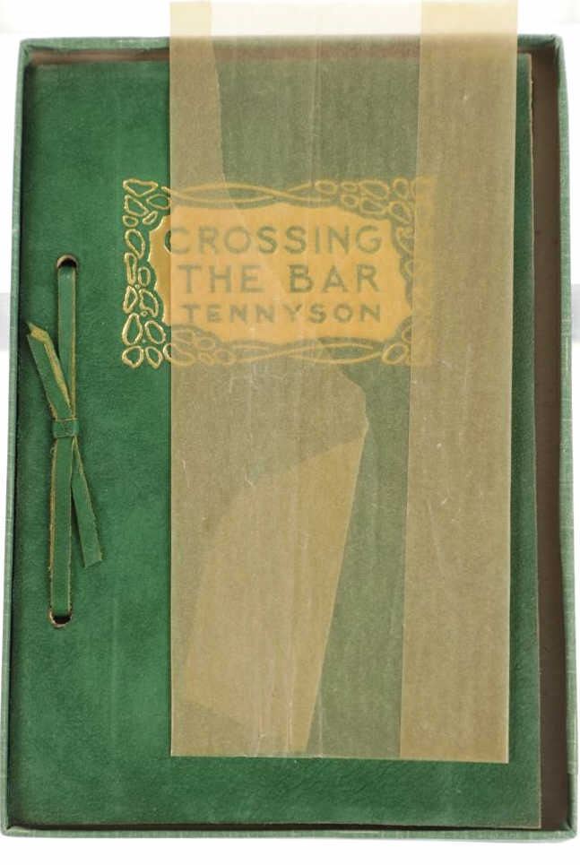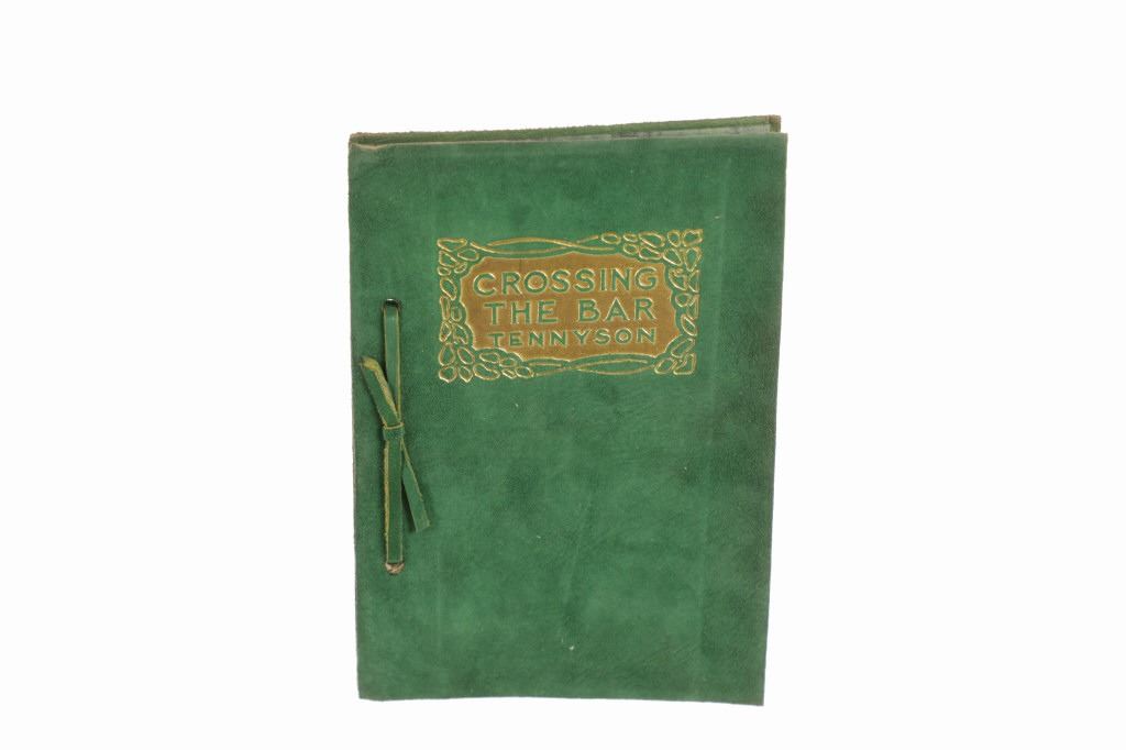 Featured in this lot is this 1890 first edition of "Crossing The Bar" by Alfred Lord Tennyson (1809-1892), published by Barse & Hopkins in New York in 1890. Alfred Tennyson, 1st Baron Tennyson FRS was an English poet. He was the Poet Laureate during much of Queen Victoria's reign. In 1829, Tennyson was awarded the Chancellor's Gold Medal at Cambridge for one of his first pieces, "Timbuktu". He published his first solo collection of poems, Poems, Chiefly Lyrical, in 1830. This book features multiple poems from multiple authors such as Whittier, Walt Whitman, Carlyle, and Seneca to name a few. The book includes the original green book case. The book features a green suede leather soft cover, bound by a green colored leather strip. There is gold gilding on the front cover, with the title and author's last name in raised green leather lettering. Each page is beautifully decorated with colored illustrations around each poem. The book and book case show good condition for their age with no signs of obvious damage. The interior pages are in good condition as well with no tears or signs of foxing present. The book measures 6 7/8" L x 4 5/8" W.