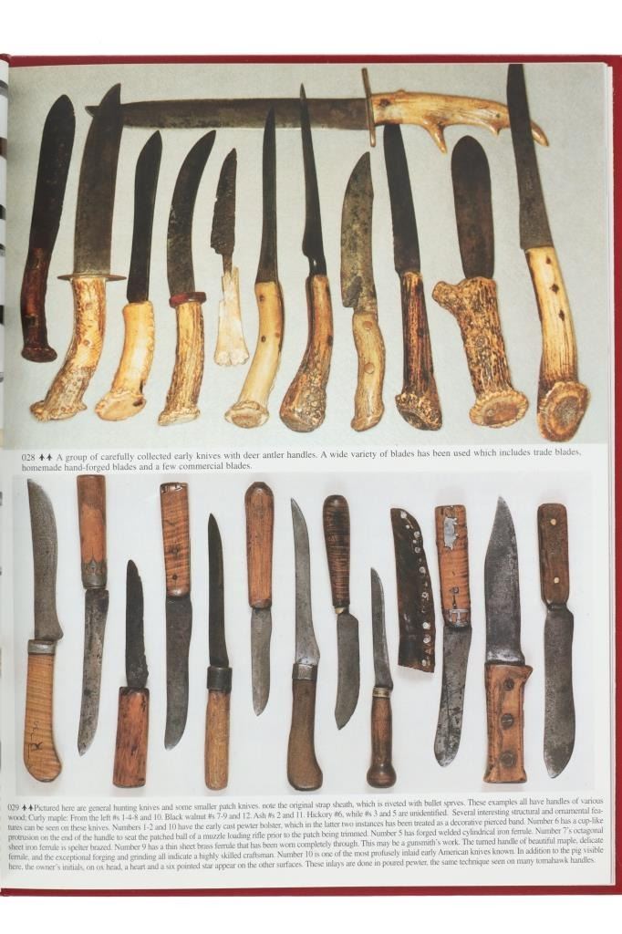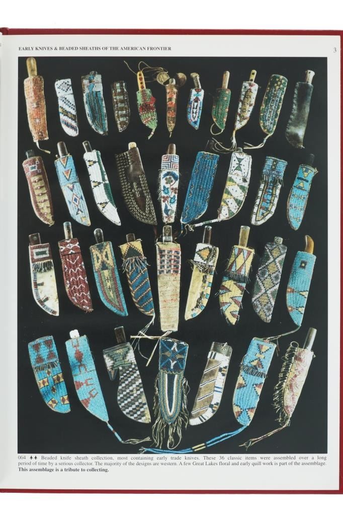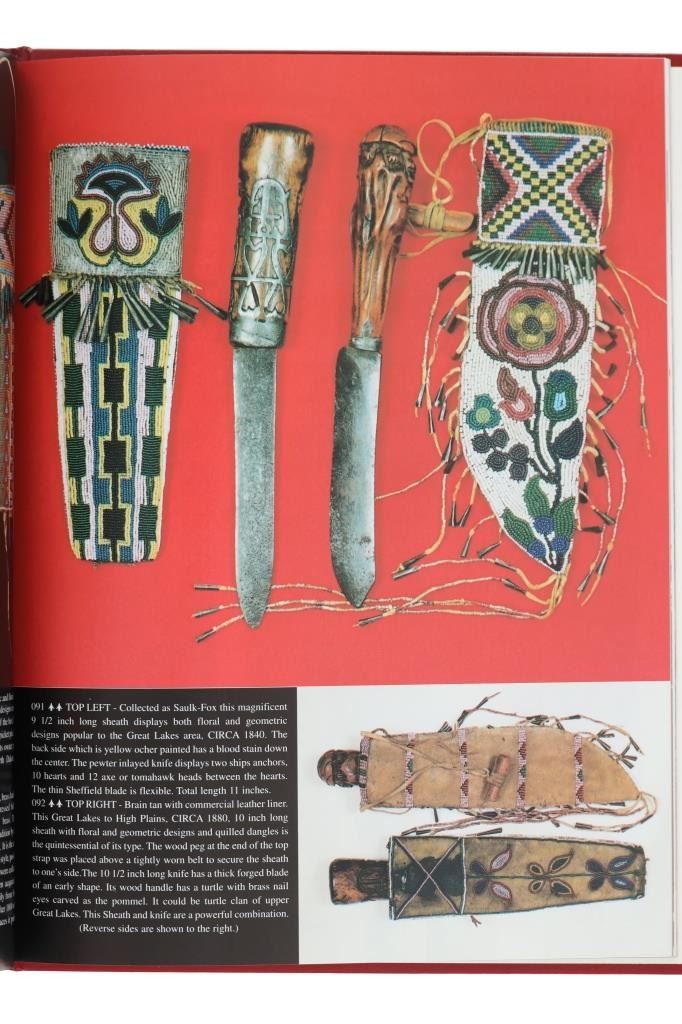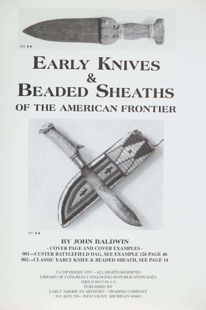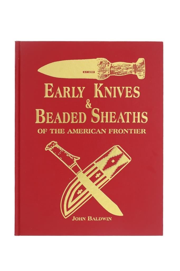 Featured in this lot is a signed 1997 first edition Knives and Beaded Sheaths by John Baldwin. The book is hand signed in the front written by John Baldwin. The book features a wonderfully and professionally crafted leather that shows a red coloration with gilt lettering reading: I & H Sorby - Early Knives & Beaded Sheaths of the American Frontier - John Baldwin. This book completely covers the highly collectable and exciting subject of Indian Early Knives & Beaded Sheaths. A historically significant perspective combined with pictures from the top collections in the country, thus ensuring authentically documented artifacts from our American frontier. Invaluable as a teaching reference with accurate detailed information. The text is written as an exciting saga of Americana. The overall condition of this book is good with no obvious signs of damage. The measurements of this book is 11 3/8"L x 8 3/4"W. The collective weight of this book is 1lb 4oz.*