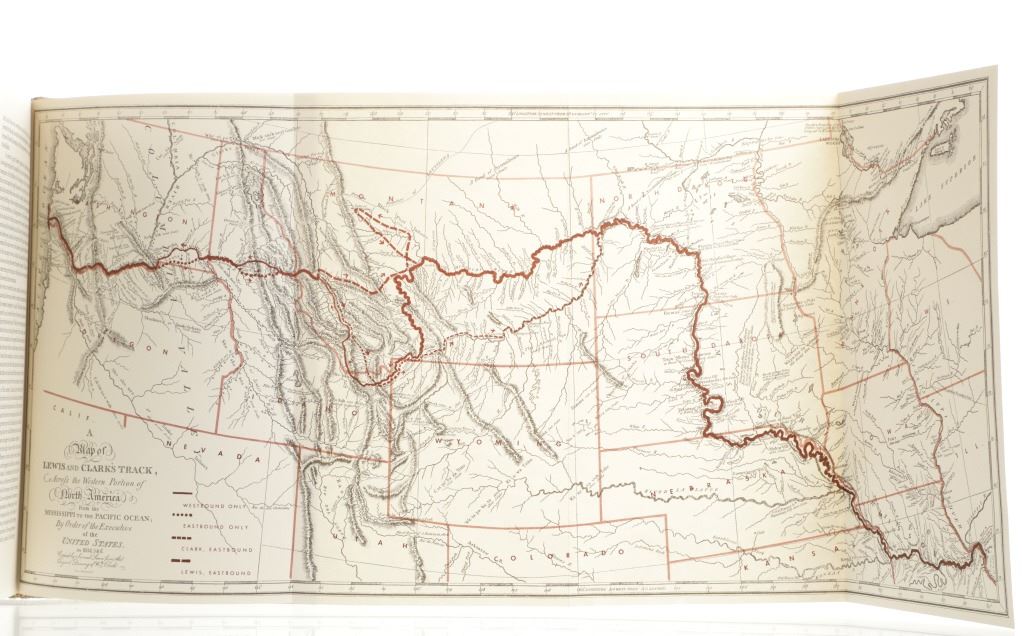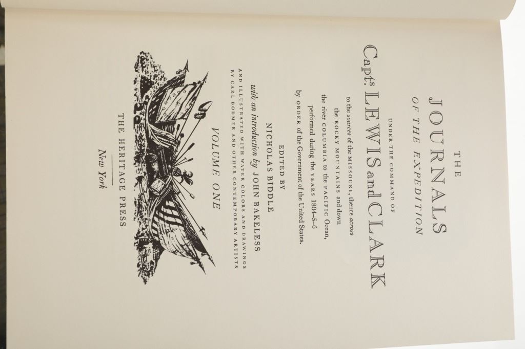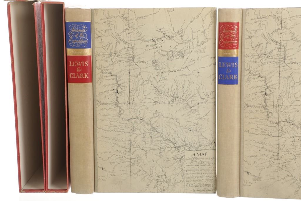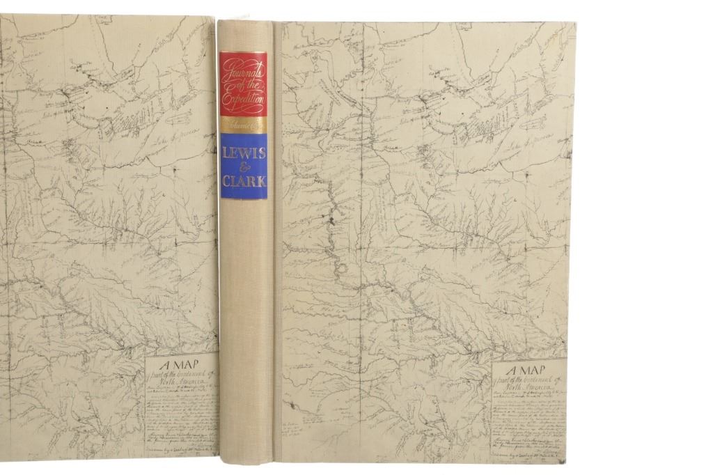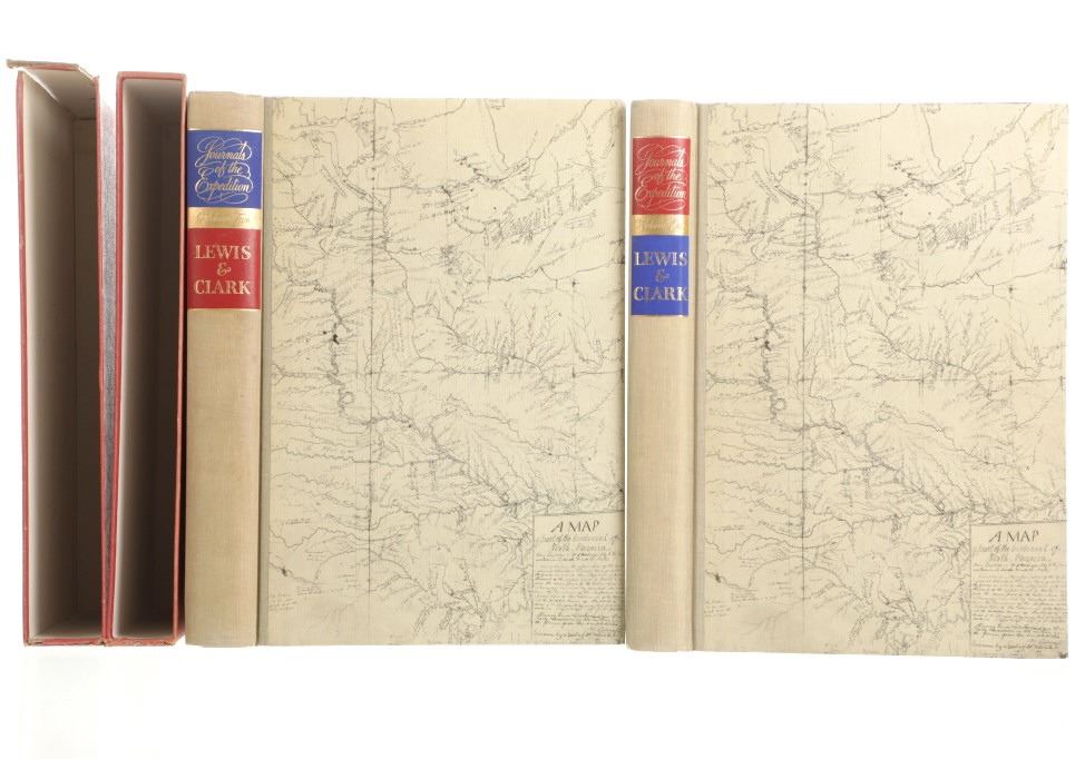 Included in this lot is this first edition of Volume I and II of “The Journals of the Expedition Under the Command of Capts. Lewis and Clark: to the Sources of the Missouri, thence across the Rocky Mountains and down the river Columbia to the Pacific Ocean, performed during the years 1804-5-6 by order of the Government of the United States.” The book was edited by Nickolas Biddle and features an introduction by John Bakeless. It was illustrated with watercolors and drawings by Carl Bodmer and other contemporary artists. John Bakeless has written over a dozen books, including "Lewis and Clark, Partners in Discovery", one of the first and foremost scholarly works on Meriwether Lewis and William Clark. This edition also includes sixteen full-page plates in four, five, and six colors. Thirteen of the plates are from paintings by Carl Bodmer and three paintings by George Bird King. They are bound in decorated parchment-toned buckram with a map design in sepia and buckram spine labels hand-lettered and stamped in pure gold leaf. They are in the original slipcase. The condition of this two-volume set is good and extremely well-preserved, sleeves of the books are split at the seams. The measurements of these books are 12"L x 8.25"W x 1.5"D for both books.