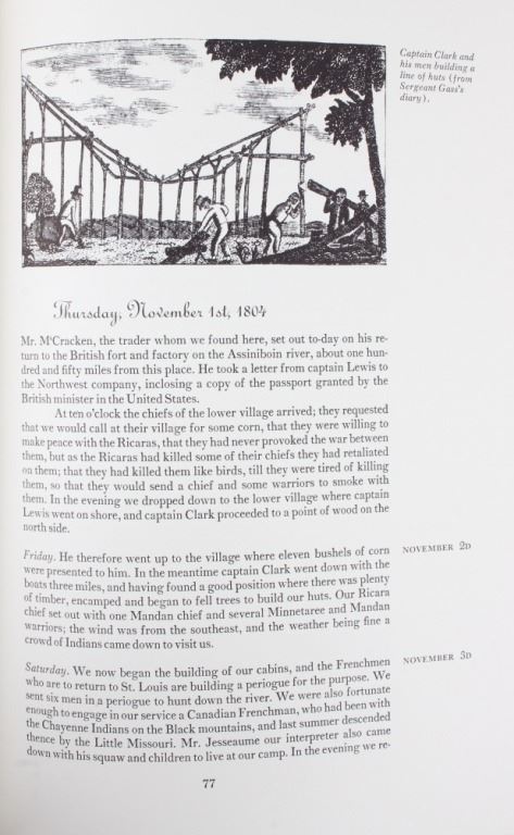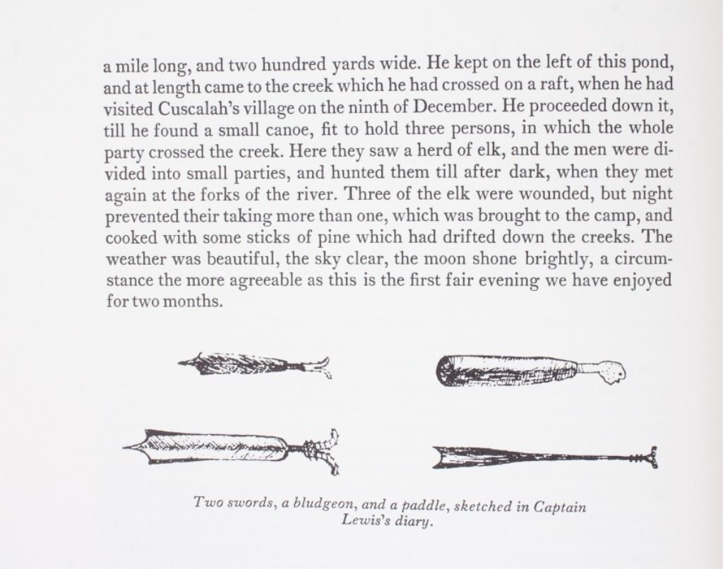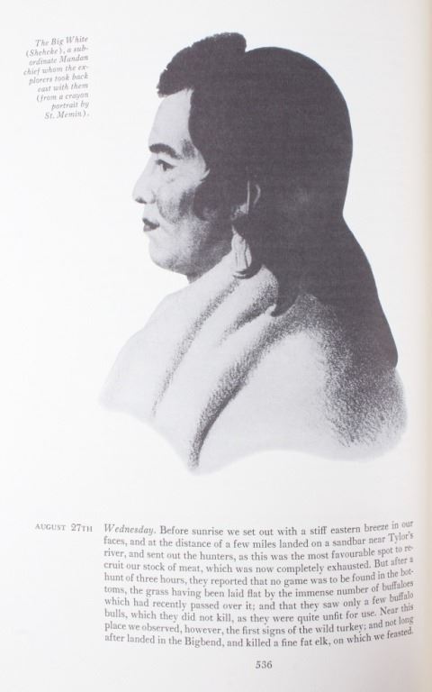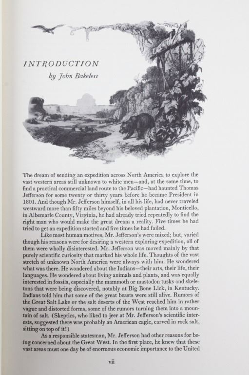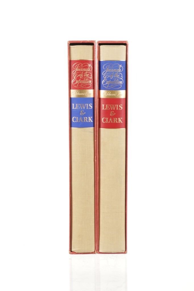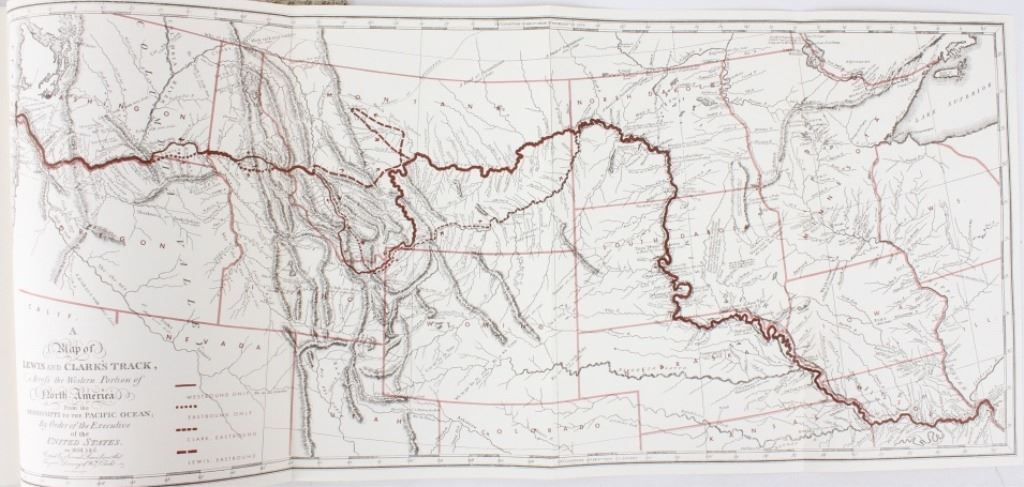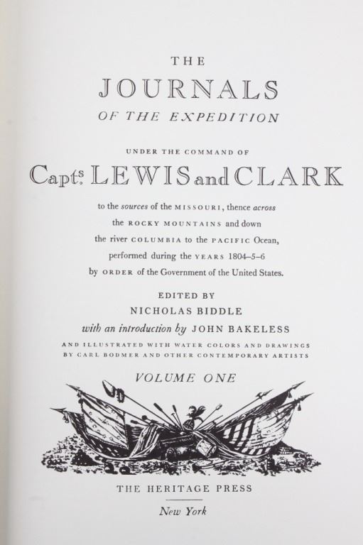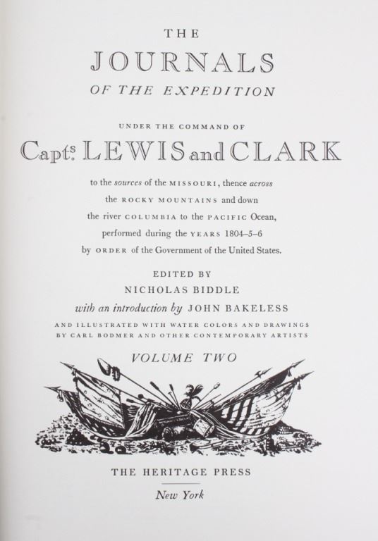For your consideration is this first edition of Volume I and II of “The Journals of the Expedition Under the Command of Capt. 's Lewis and Clark: to the Sources of the Missouri, thence across the Rocky Mountains and down the river Columbia to the Pacific Ocean, performed during the years 1804-5-6 by order of the Government of the United States”. The books were edited by Nickolas Biddle, introduced by John Bakeless, and illustrated with water colors and drawings by Carl Bodmer and other contemporary artists. John Bakeless has written over a dozen books, including "Lewis and Clark, Partners in Discovery", one of the first and foremost scholarly works on Meriwether Lewis and William Clark. This edition also includes sixteen full-page plates in four, five, and six colors. Thirteen of the plates are from paintings by Carl Bodmer and three paintings are by George Bird King. They are bound in decorated parchment-toned buckram with a map design in sepia and buckram spine labels hand-lettered and stamped in pure gold leaf. They are on the original slipcase. The condition of this two volume set is good and well-preserved, showing some wear to the sleeves of the books. The measurements of these books are 12" x 8 1/4" for both books.
