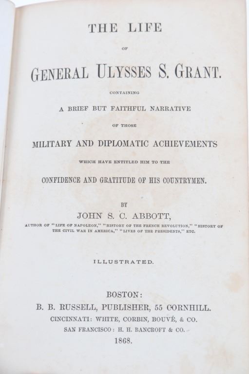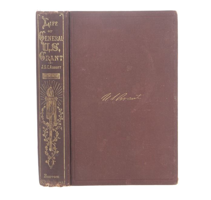 Offered in this lot is an 1868 first edition of "The Life of General Ulysses S Grant" by John S.C. Abbott. Shortly before the Ulysses S Grant’s presidency began, John SC Abbott wrote a biographical sketch of the Civil War hero and general. Abbott wrote what would become one of the best accounts of Grant’s military career and his significant victories in the Civil War. Other noteworthy topics include: The Battle of Shiloh, Battle of Vicksburg, Grant at Missionary Ridge, Notes on Abraham Lincoln’s second Inauguration, and Grant’s perspective on Sherman’s March. This book is in very good condition for its over 150-year age; the construction is strong with minor wear to the brown cover. The book has gold embossed lettering on the spine and Grant’s signature on the cover. The book measures 7 3/4" x 5 1/4" x 1 ¼".