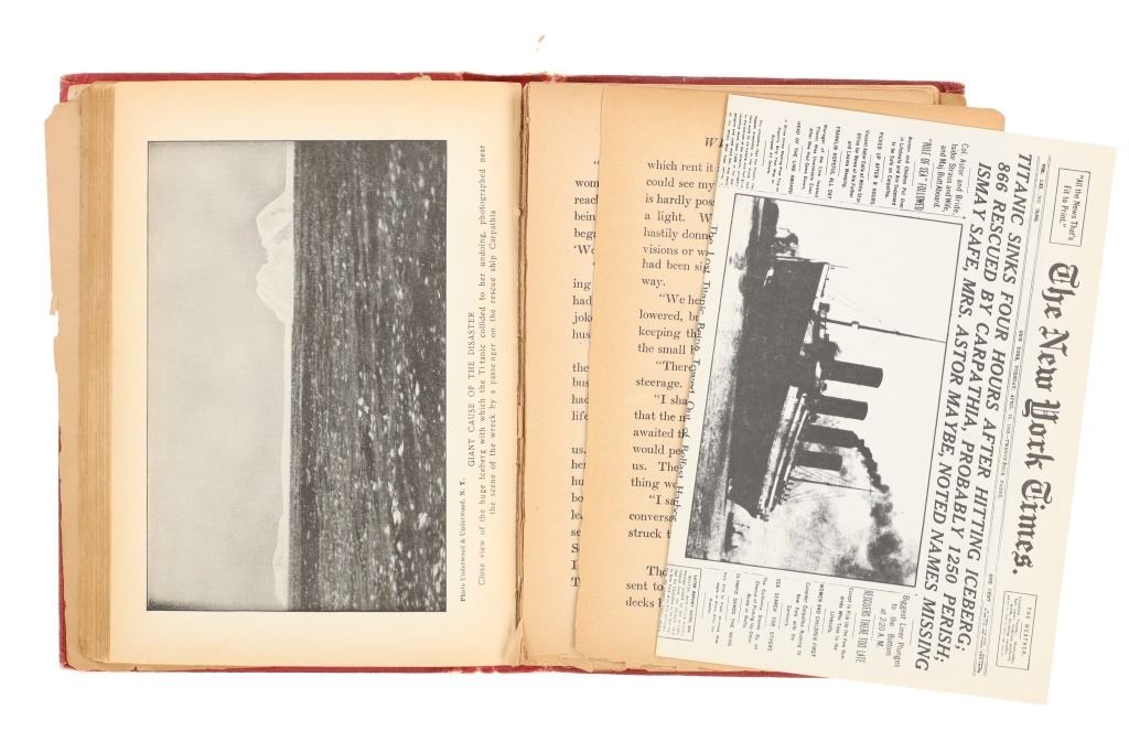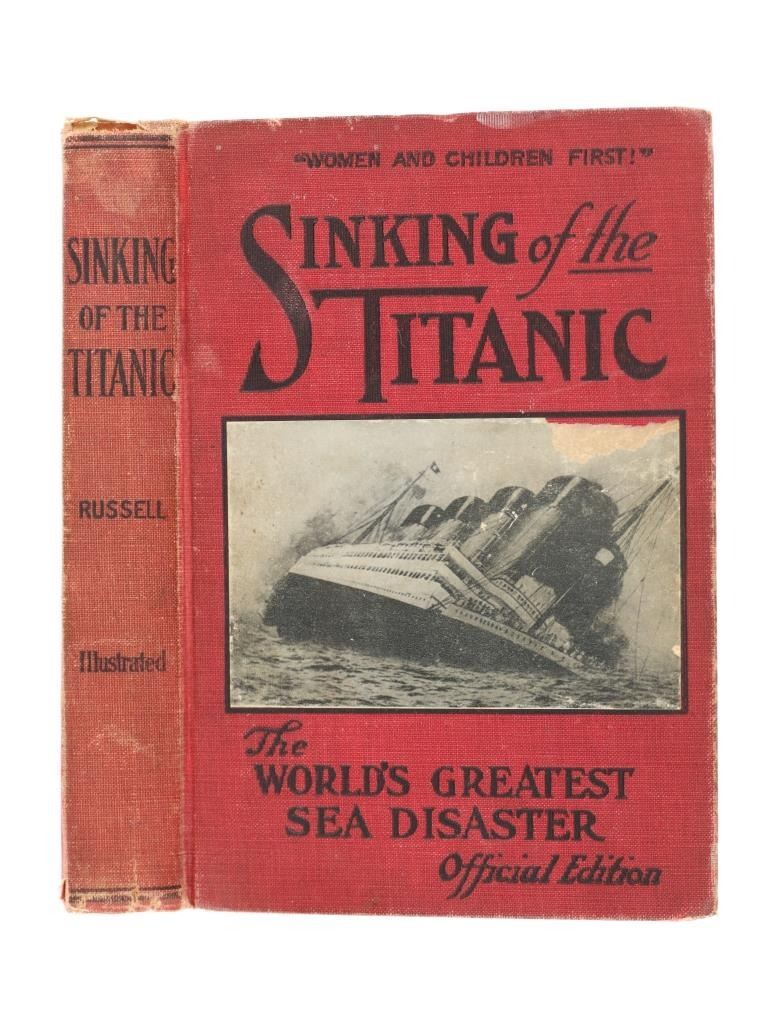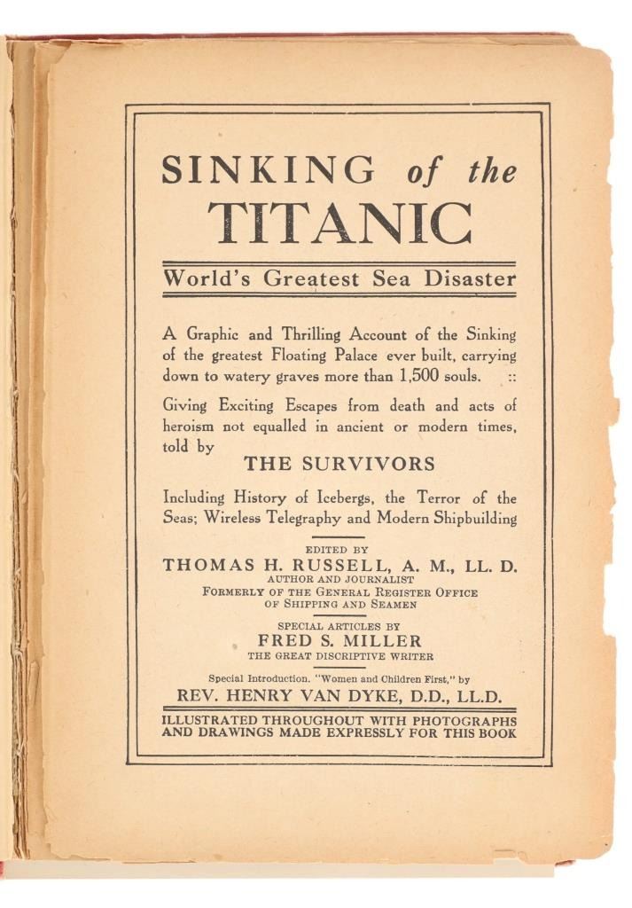 For your consideration this lot is a First Edition of "Sinking Of The Titanic" 1912, editor Thomas H. Russell, copyright L. H. Walter. "Sinking of the Titanic World's Greatest Sea Disaster A Graphic and Thrilling Account of the Sinking of the greatest Floating Palace ever built, carrying down to watery graves more than 1500 souls. Giving Exciting Escapes from death and acts of heroism not equalled in ancient or modern times, told by THE SURVIVORS Including History of Icebergs, the Terror of the Seas; Wireless Telegraphy and Modern Shipbuilding. Edited by THOMAS H. RUSSELL, A. M., LL. D. Author and Journalist Formerly Of The General Register Office Of Shipping And Seamen Special Articles By FRED S. MILLER The Great Descriptive Writer Special Introduction, 'Women and Children First,' by REV. HENRY VAN DYKE, D. D., LL. D. Illustrated Throughout With Photographs And Drawings Made Expressly For This Book." Published in the immediate wake of the famous maritime disaster, this "graphic and thrilling account of the sinking of the greatest Floating Palace ever built" sold briskly to an eager public. A century later, its tragic tale continues to captivate readers. These contemporary reports describe the luxury liner, its passengers, and the circumstances of the wreck. Gripping narratives by survivors recount episodes of heroism and cowardice along with dramatic rescues and moving incidents of self-sacrifice. In addition to chronicling the wide-ranging outpouring of grief and the establishment of many memorials, this fascinating compilation presents expert analysis of the shipwreck's causes and the findings of a Senate investigation convened to determine responsibility for the catastrophe. Historic photographs and specially commissioned drawings appear throughout the book. The red cloth bound stamped illustrated hardcover is in fair condition, scuffing exhibited on boards and spine, loose spine, cardstock photo illustration of the Titanic on front cover. Pages exhibit age tanning, edge damage, some loose pages. Measures 5.5"W x 8"L x 1"D
