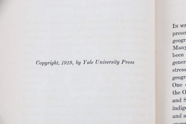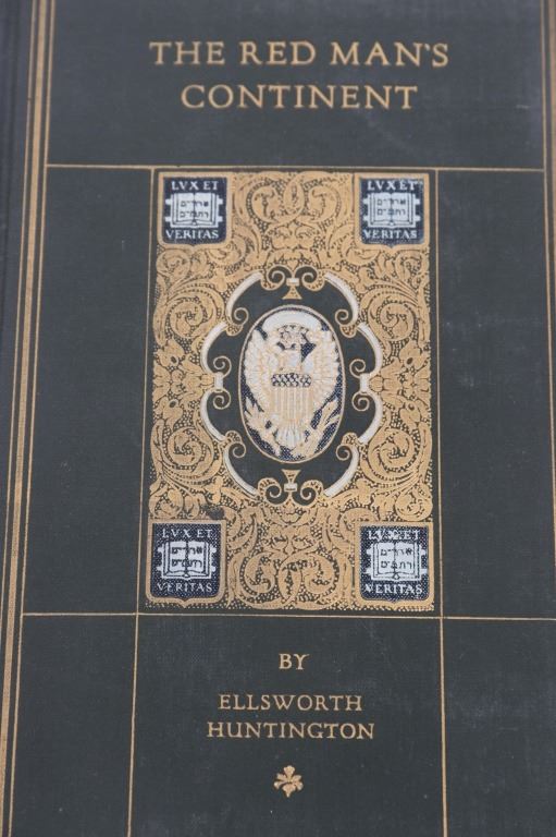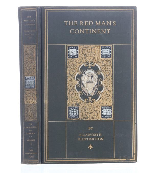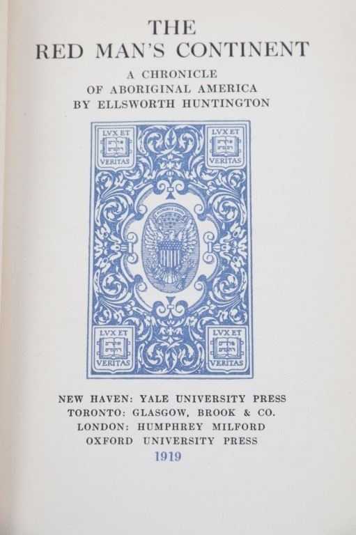 Featured in this lot is this 1919 first edition of “The Red Man's Continent” by Ellsworth Huntington. Ellsworth Huntington (September 16, 1876 – October 17, 1947) was a professor of geography at Yale University during the early 20th century, known for his studies on environmental determinism/climatic determinism, economic growth, economic geography, and scientific racism. He served as President of the Ecological Society of America in 1917, the Association of American Geographers in 1923, and President of the Board of Directors of the American Eugenics Society from 1934 to 1938. This book was published in 1919 by Yale University Press. This book presents the main facts about the geographical environment of American history and the influence of geographical conditions upon the life of the primitive Indians. The condition of this book is good with no obvious signs of damage and in good overall condition. The measurements of this book are 8 1/8" x 5 1/4".