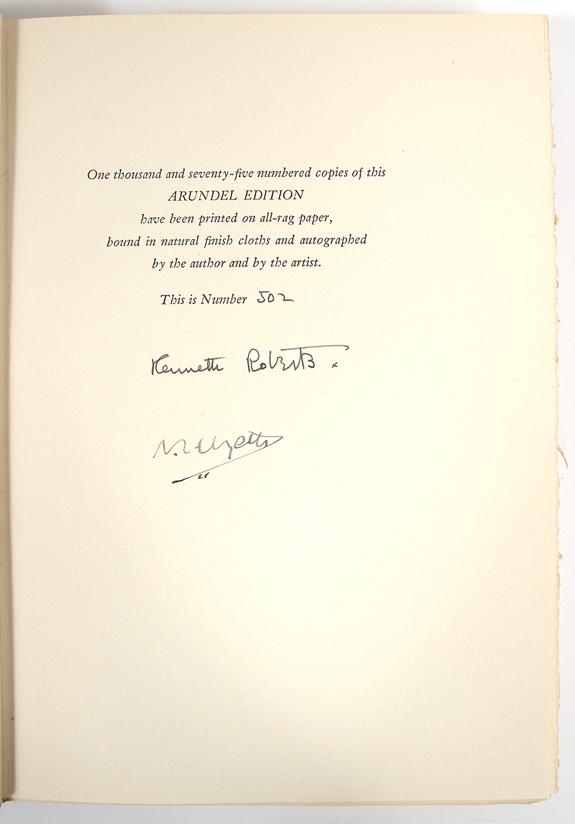 1st Ed. "Trending Into Maine" Signed by Roberts & Wyeth. First Edition, published May 1938 (Boston: Little, Brown and Company). With Illustrations by N.C. Wyeth, Signed by Roberts and N.C. Wyeth, who on the limited page, No. 502 of 1,075 copies. Arundel Edition, 384 pages plus index. Internally tight and clean; many pages uncut. Spine darkened and bumped. Case is worn and chipped. Accompanied by an extra suite of 14 Wyeth plates.