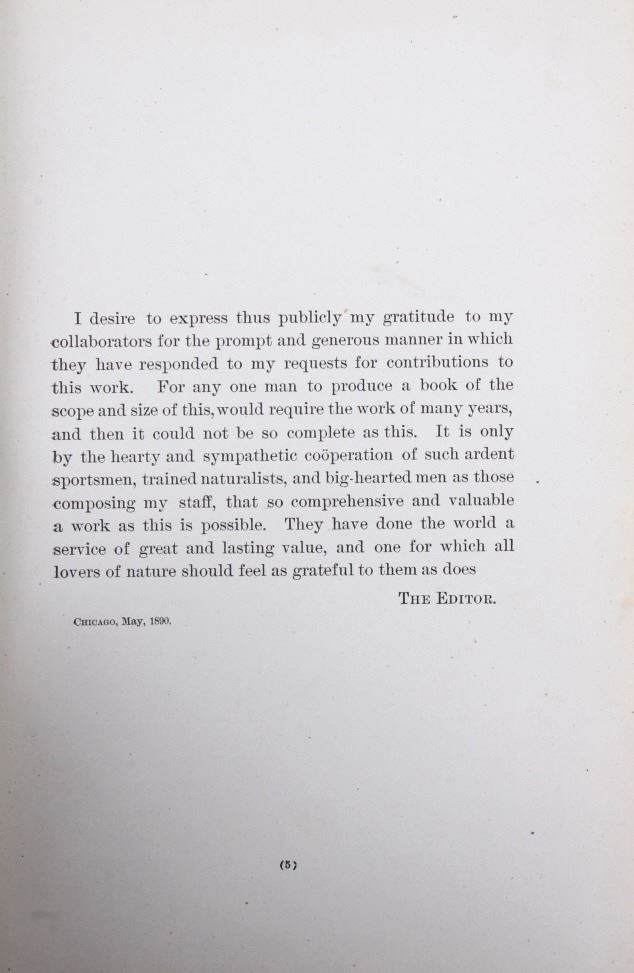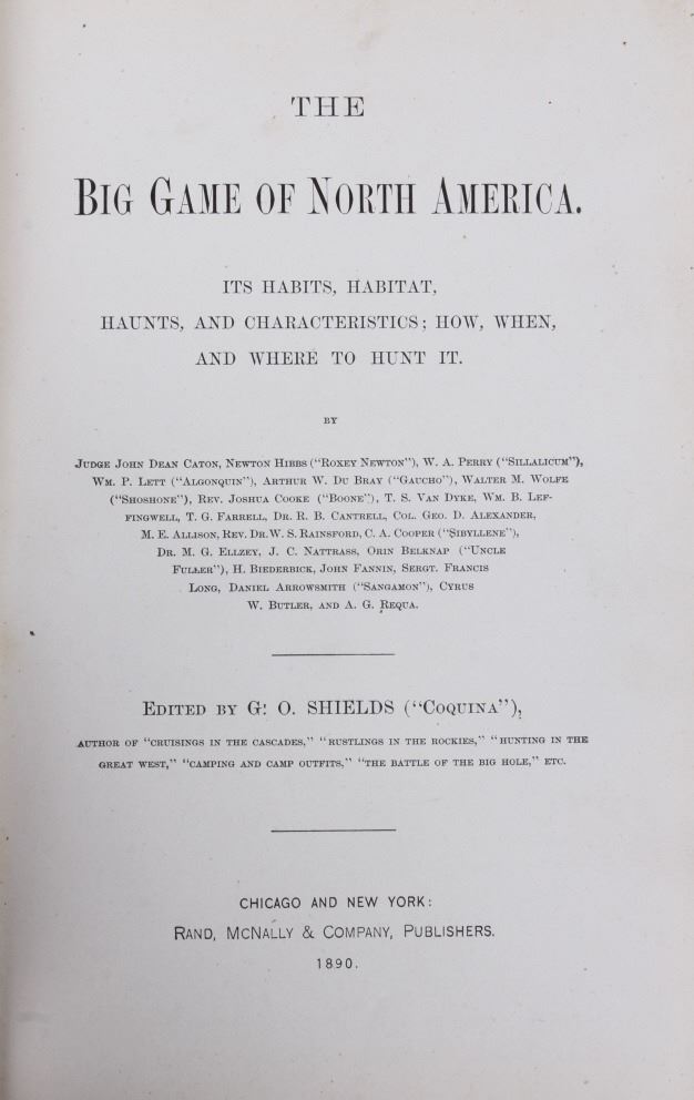 For your consideration is this first edition copy of “The Big Game of North America” compiled by George Oliver Shields and from 1890. This book compiles the habits, haunts, and characteristics of North American big game—the how, when, and where of hunting the big game of North America. Published by Rand, McNally & company in 1890, this book still has the original pictorial red cloth with gilt. This is a first edition of big game hunting lore, with 27 full page illustrations and numerous in text vignettes. This book includes Judge John Dean Caton's treatise, "The Ethics of the Field Sports." This book is in fine condition, showing beveled boards, bindings that are tight, and strong hinges. The text is bright with minimal to no shelf wear. The measurements of this book are 6 3/4" x 9 1/2".