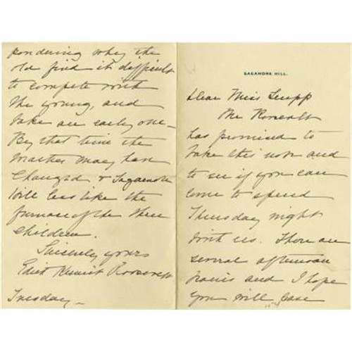 <B>First Lady Edith Roosevelt Autograph Letter Signed</B></I> “<I>Edith Kermit Roosevelt</B></I>”. Two pages, 4.5” x 7”, on Sagamore Hill letterhead, Oyster Bay, New York, “<I>Tuesday</B></I>”, to a Miss Leupp. A charming letter in which Edith Roosevelt, second wife of Theodore Roosevelt, invites a young woman to Sagamore Hill for a visit. She writes in part: “<I>Mr. Roosevelt has promised to take this note and see if you can come to spend Thursday night with us. There are several afternoon trains and I hope you will cease pondering why the old find it difficult to compete with the young…</B></I>”. The Miss Leupp in question may be the daughter of Francis E. Leupp, a friend of Teddy's and his Commissioner of Indian Affairs. With the usual fold creases, else fine. <I>From the collection of Henry E. Luhrs.</B></I><BR><BR><b>Shipping:</b> Flat Material, Small (<a target="_blank" href="http://www.heritageauctions.com/common/shipping.php">view shipping information</a>)