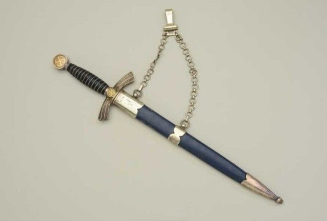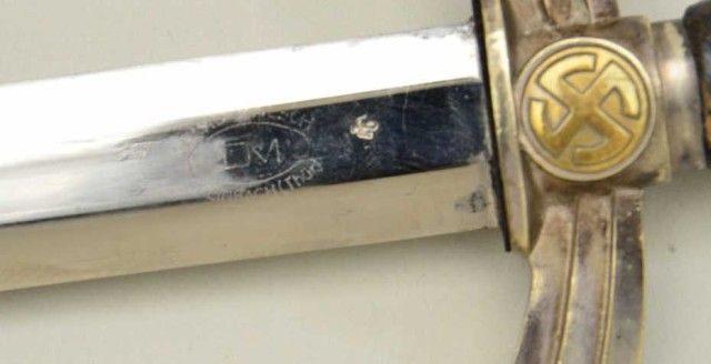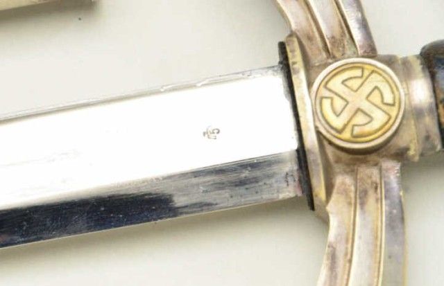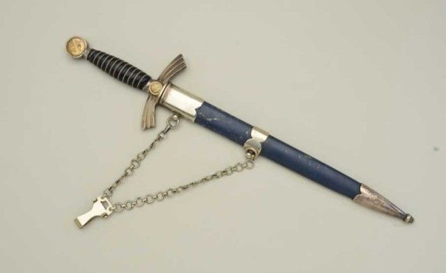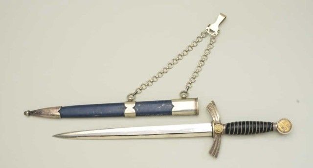 1st Model Luftwaffe dagger from Nazi Era, blade shows “David Malach” maker’s mark with small proof and blade is fine to excellent with just slight scratches and nearly original finish. The mounts and grip showslight aging and a hanger are included. The body of the scabbard is painted blue rather than wrapped in leather and 80% paint remains. Est.;$400-$800.