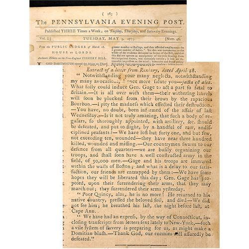 <Our item number 140689><B>[Lexington-Concord] 1775 Philadelphia Newspaper Publishes A Letter On the Battle.</B> "The Pennsylvania Evening Post," 4pp, 10 x 8 in., Philadelphia, Pennsylvania, Tuesday, May 9, 1775. Printed by Benjamin Towne, who would be the first to print the Declaration of Independence in a newspaper. "The Pennsylvania Evening Post," was the first newspaper printed in Philadelphia, and the only paper to be published in Philadelphia throughout the Revolutionary War. Printed on rag content, laid paper; except for extensive light soiling and foxing, and some marginal stains, none of which affects legibility, this issue is in near fine condition. An "Extract of a letter from Roxbury, dated April 28" is published on the third page. This letter was also published in the papers of the Connecticut Assembly and it is noted there that it was penned to "a Gentleman in Newport, Rhode-Island." <BR>The letter, in part: "…What folly could induce Gen. Gage to act a part so fatal to Britain. - It is all over with them - their withering laurels will soon be plucked from their brows by the rapacious Bourbon… Is it not truly amazing, that such a body of regulars, so thoroughly appointed, with artillery, &c. should be defeated, and put to flight, by a handful of raw, undisciplined peasants? - We have lost but forty one, and but few, not exceeding ten, wounded - they have near three hundred killed, wounded and missing. Our countrymen swarm to our defence from all quarters - we are busily organizing our troops, and shall soon have a well constructed army in the field of 30,000 men. Gage and his troops are immured within the walls of Boston, and what is a delay to our satisfaction, our friends are entrapped by them: - We have some hopes they will be liberated this day; Gen. Gage has proposed, upon their surrendering their arms, that they may march out; they surrendered their arms yesterday….Thank God, our enemies will assuredly be defeated." <BR>Estimated V alue $4,000 - 6,000. <BR><BR>Our item number 140689<BR><IMAGES><P ALIGN="CENTER"><IMG SRC="http://www.goldbergcoins.net/liveauction/49jpegs/140689.jpg"> <BR><IMG SRC="http://www.goldbergcoins.net/liveauction/49jpegs/140689N2.jpg"> </P></IMAGES>