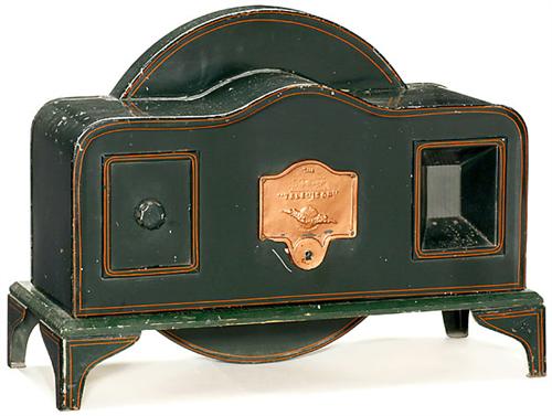 Das 1. Fernsehgerät der Welt: "Baird Televisor", 1929 Außerordentlich seltenes Schaufenster-Modell. Exaktes Metall-Gehäuse des "Televisor" des von John Logie Baird entwickelten Fernsehsystems mit der weltberühmten "Nipkow-Scheibe". Lackiertes Metallgehäuse mit Bronze-Plaketten-Abdruck. Beleuchtetes Bildfenster mit gedrucktem Porträt von J. L. Baird. - Ein Meilenstein der Fernsehgeschichte und das weltweit einzige bekannte Schaufenster-Displaystück!