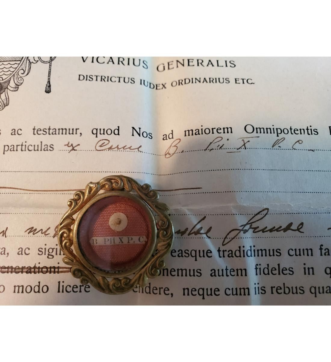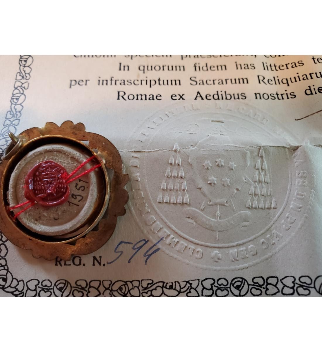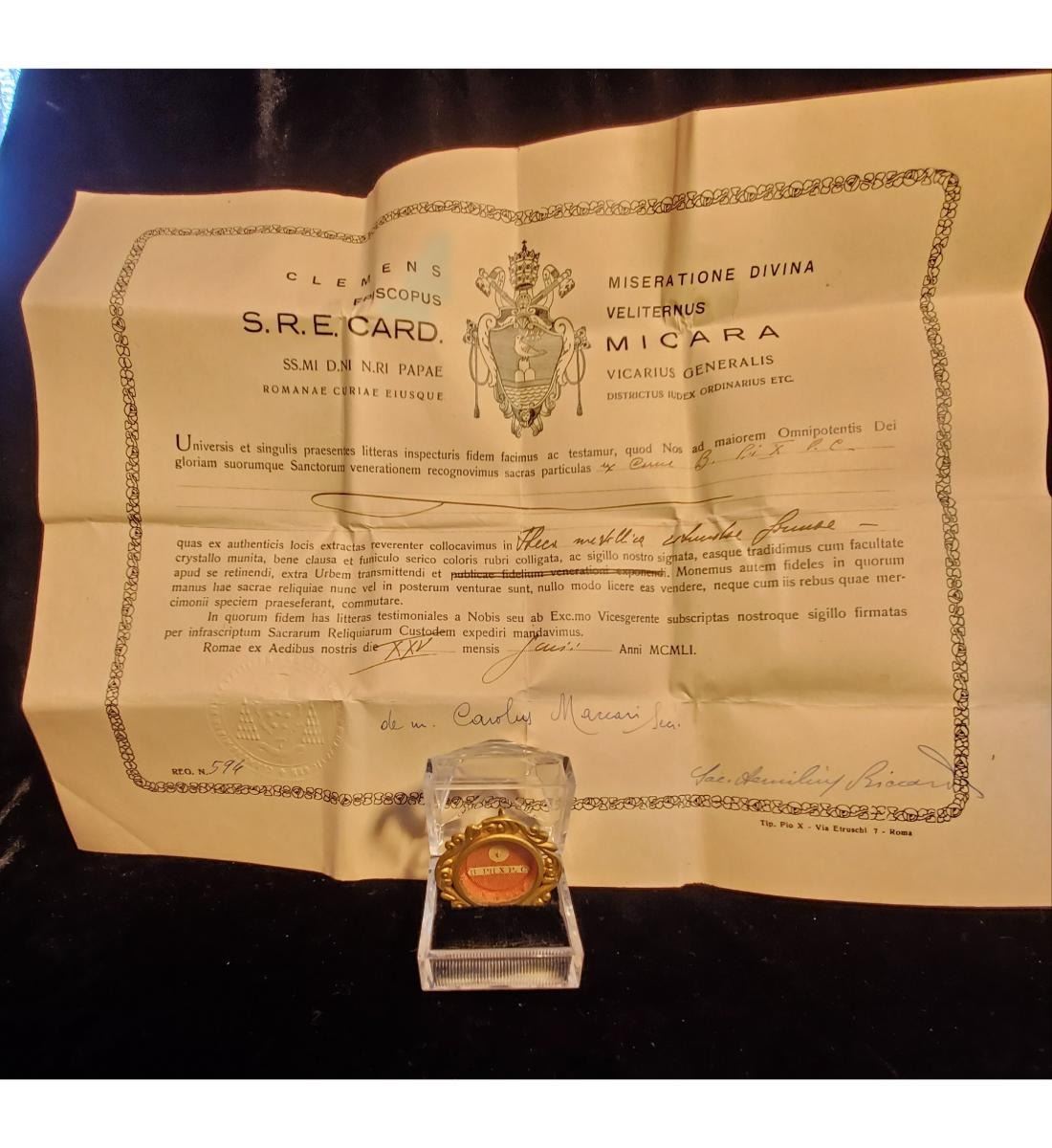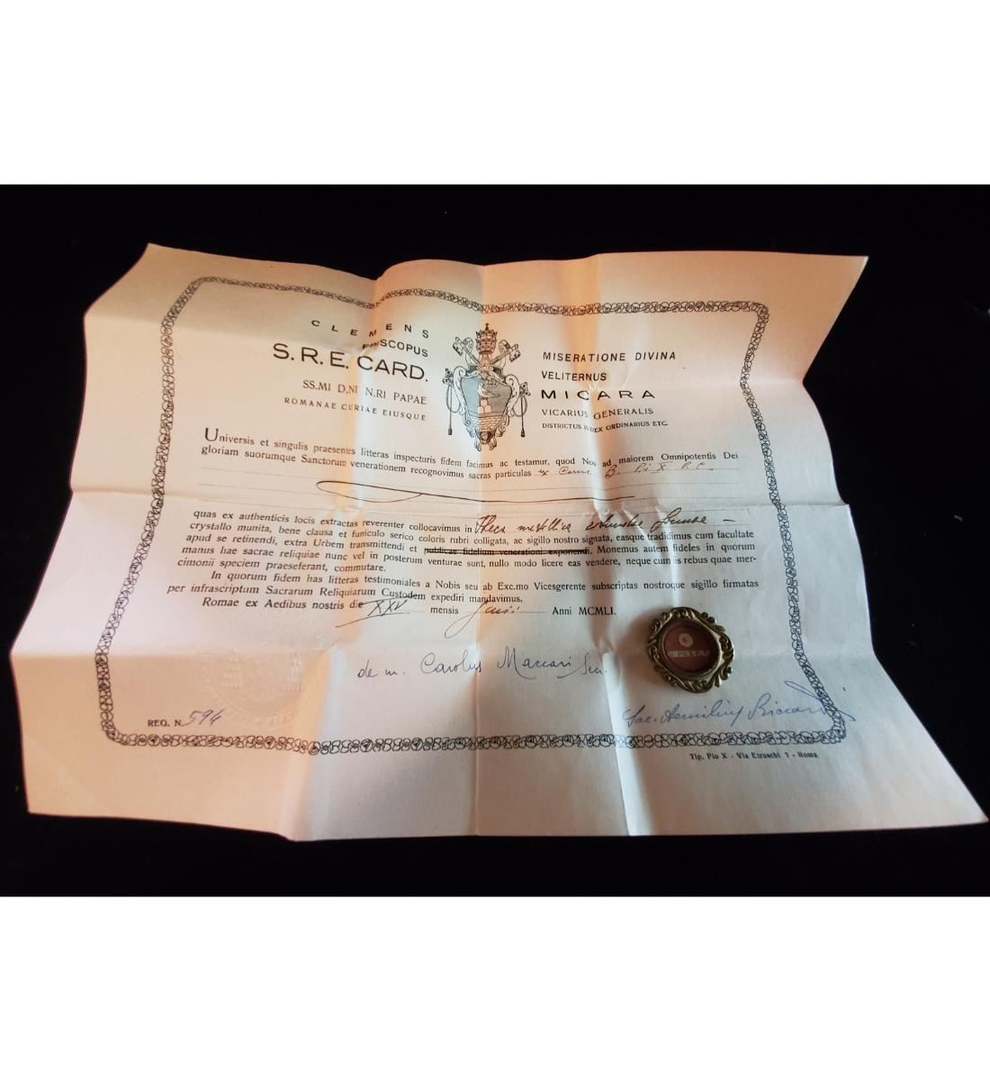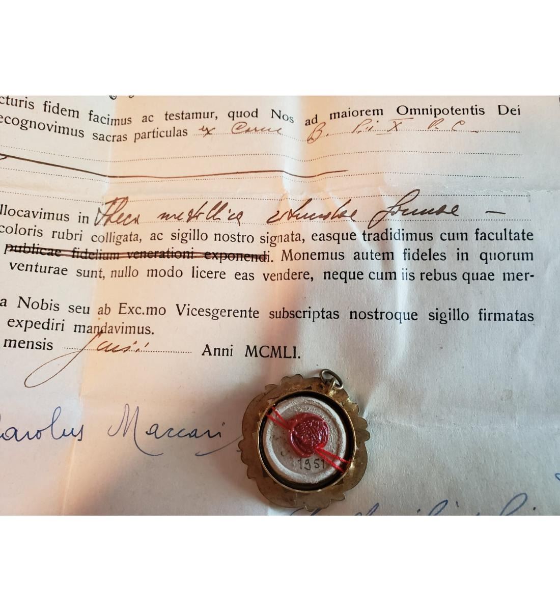 1st class relic (carne) of Blessed Pius X with authentication document dated 1951