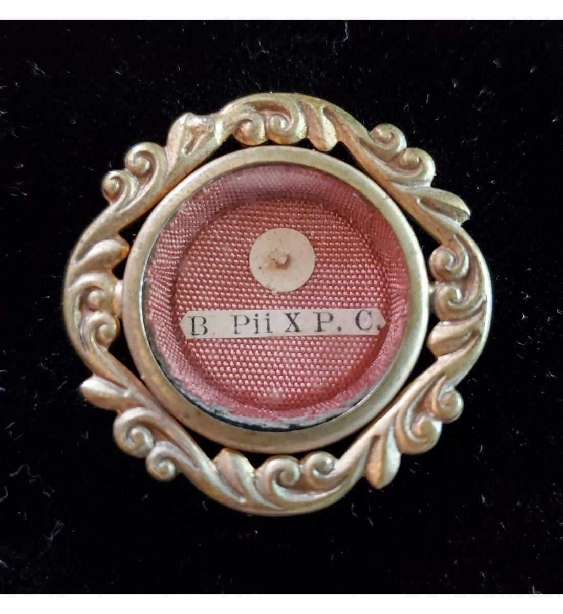 1st class relic (carne) of Blessed Pius X with authentication document dated 1951. Pope Pius X is noted for vigorously opposing modernistic interpretations of Catholic doctrine. The relic is contained in a fancy gold round theca. The theca is housed in an acrylic type Gothic presentation case. All relics are guaranteed to be authentic and come from a 40 year old collection. A wonderful catholic religious treasure. Relics today from Rome are impossible to acquire unless you are a priest and have your Bishops permission. They are becoming very scarce and soon unobtainable for future devotees.