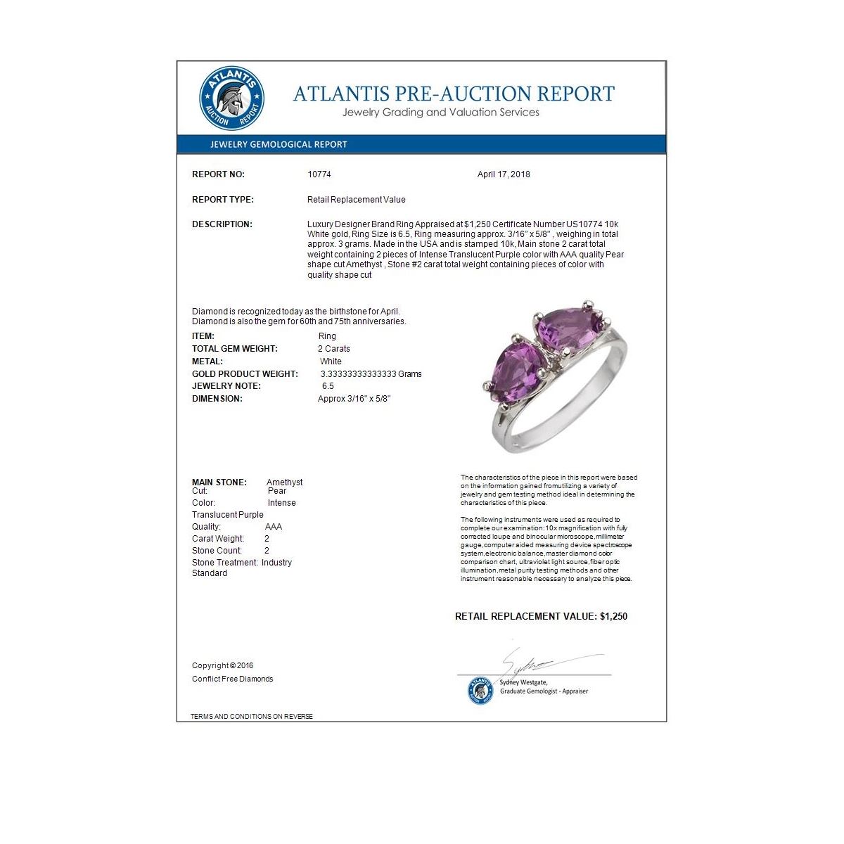 REF-18T9M -10774 ---- 2.0 CTW Amethyst Ring 10K White Gold ---- Luxury Designer Brand Ring Appraised at $1,250 Certificate Number US10774 10k White gold, Ring Size is 6.5, Ring measuring approx. 3/16" x 5/8" , weighing in total approx. 3 grams. Made in the USA and is stamped 10k, Main stone 2 carat total weight containing 2 pieces of Intense Translucent Purple color with AAA quality Pear shape cut Amethyst , Stone #2 carat total weight containing pieces of color with quality shape cut