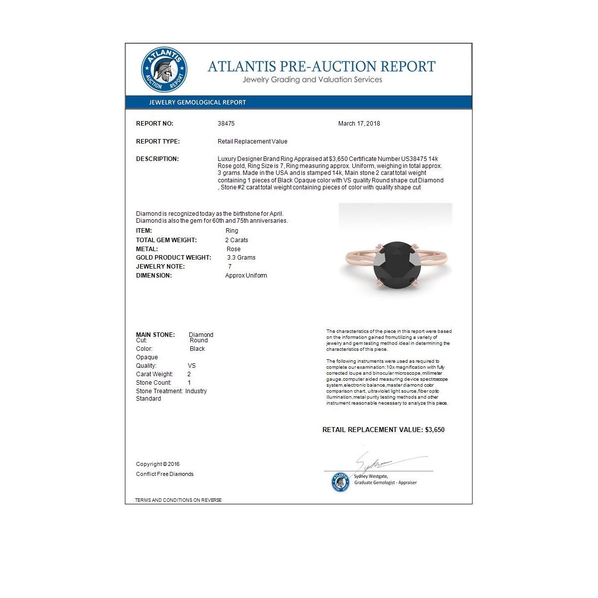 REF-60N4Y -38475 ---- 2.0 CTW Black Diamond Engagement Designer Ring 14K Rose Gold ---- Luxury Designer Brand Ring Appraised at $3,650 Certificate Number US38475 14k Rose gold, Ring Size is 7, Ring measuring approx. Uniform, weighing in total approx. 3 grams. Made in the USA and is stamped 14k, Main stone 2 carat total weight containing 1 pieces of Black Opaque color with VS quality Round shape cut Diamond , Stone #2 carat total weight containing pieces of color with quality shape cut
