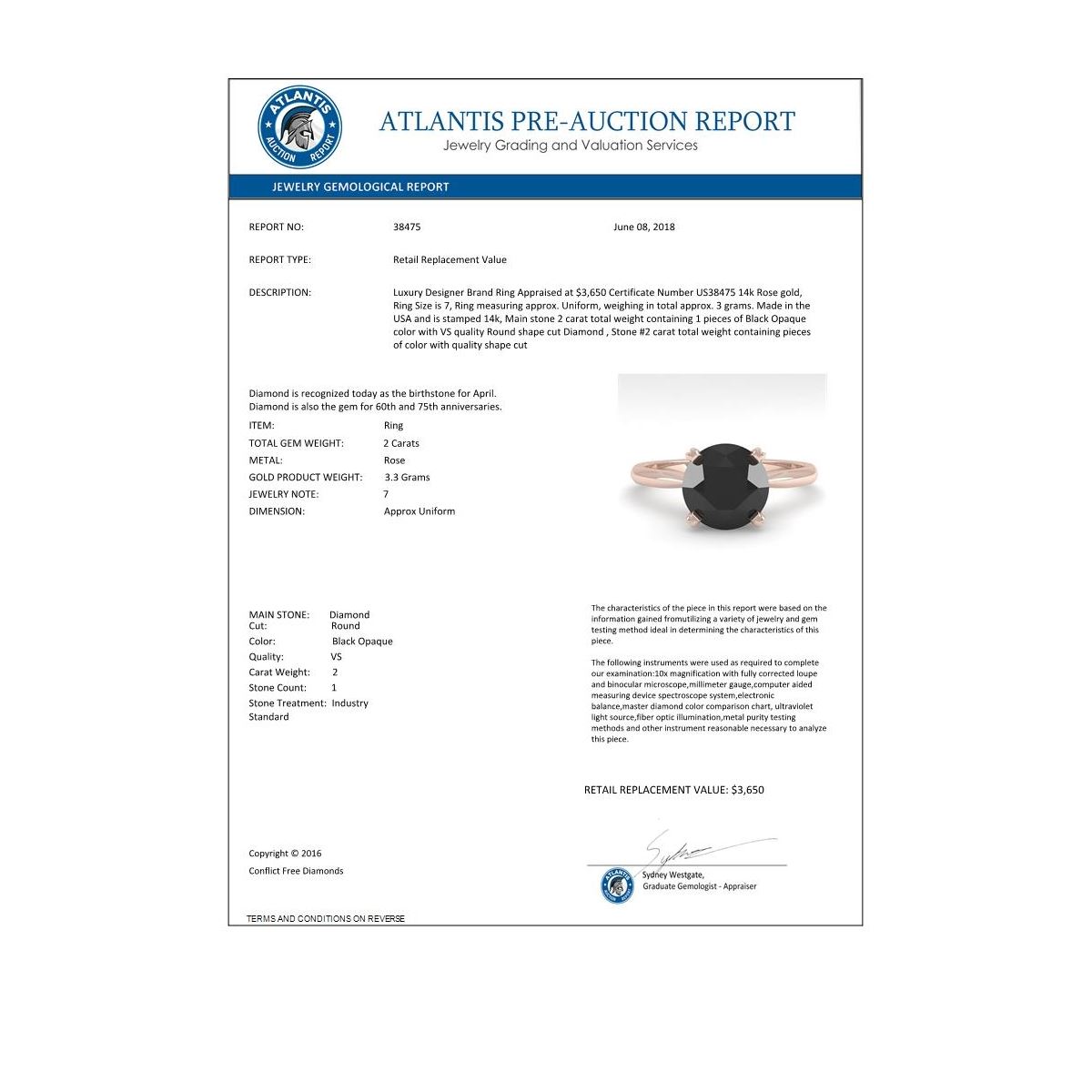 REF-60N4Y -38475 ---- 2.0 CTW Black Diamond Engagement Designer Ring 14K Rose Gold ---- Luxury Designer Brand Ring Appraised at $3,650 Certificate Number US38475 14k Rose gold, Ring Size is 7, Ring measuring approx. Uniform, weighing in total approx. 3 grams. Made in the USA and is stamped 14k, Main stone 2 carat total weight containing 1 pieces of Black Opaque color with VS quality Round shape cut Diamond , Stone #2 carat total weight containing pieces of color with quality shape cut