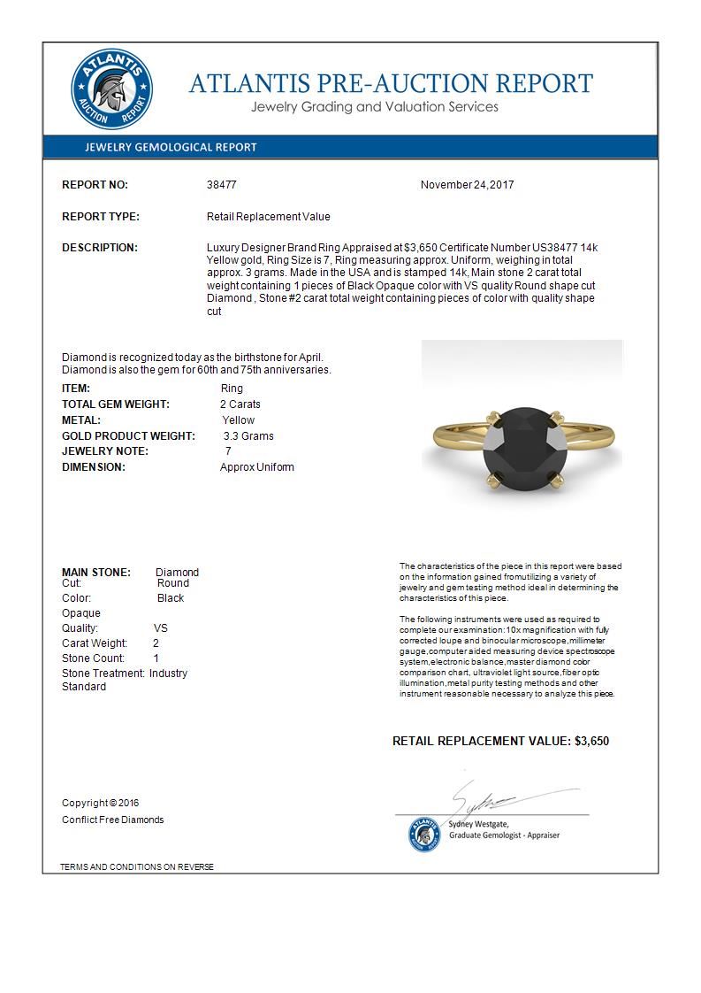 REF-60W4F -38477 ---- 2.0 CTW Black Diamond Engagement Designer Ring 14K Yellow Gold ---- Luxury Designer Brand Ring Appraised at $3,650 Certificate Number US38477 14k Yellow gold, Ring Size is 7, Ring measuring approx. Uniform, weighing in total approx. 3 grams. Made in the USA and is stamped 14k, Main stone 2 carat total weight containing 1 pieces of Black Opaque color with VS quality Round shape cut Diamond , Stone #2 carat total weight containing pieces of color with quality shape cut