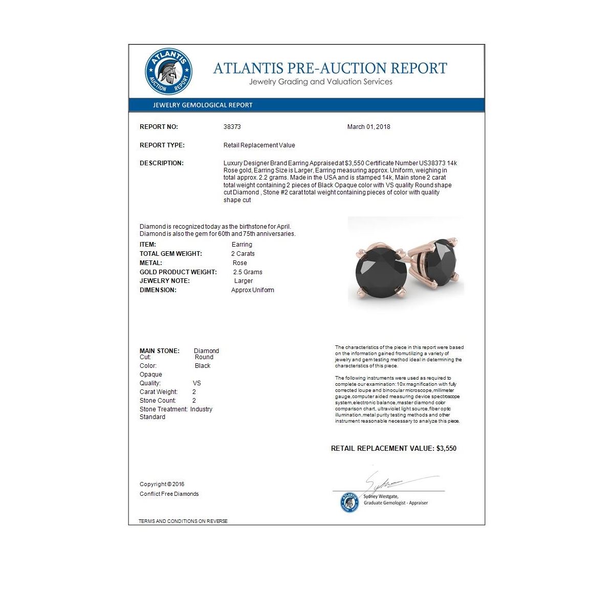 REF-58H4A -38373 ---- 2.0 CTW Black Diamond Stud Designer Earrings 14K Rose Gold ---- Luxury Designer Brand Earring Appraised at $3,550 Certificate Number US38373 14k Rose gold, Earring Size is Larger, Earring measuring approx. Uniform, weighing in total approx. 2.2 grams. Made in the USA and is stamped 14k, Main stone 2 carat total weight containing 2 pieces of Black Opaque color with VS quality Round shape cut Diamond , Stone #2 carat total weight containing pieces of color with quality shape cut