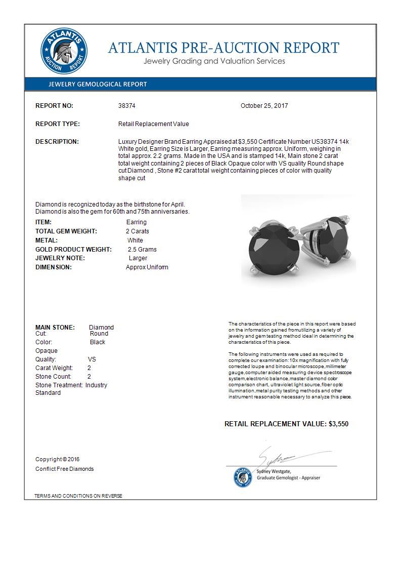 REF-58W4F -38374 ---- 2.0 CTW Black Diamond Stud Designer Earrings 14K White Gold ---- Luxury Designer Brand Earring Appraised at $3,550 Certificate Number US38374 14k White gold, Earring Size is Larger, Earring measuring approx. Uniform, weighing in total approx. 2.2 grams. Made in the USA and is stamped 14k, Main stone 2 carat total weight containing 2 pieces of Black Opaque color with VS quality Round shape cut Diamond , Stone #2 carat total weight containing pieces of color with quality shape cut