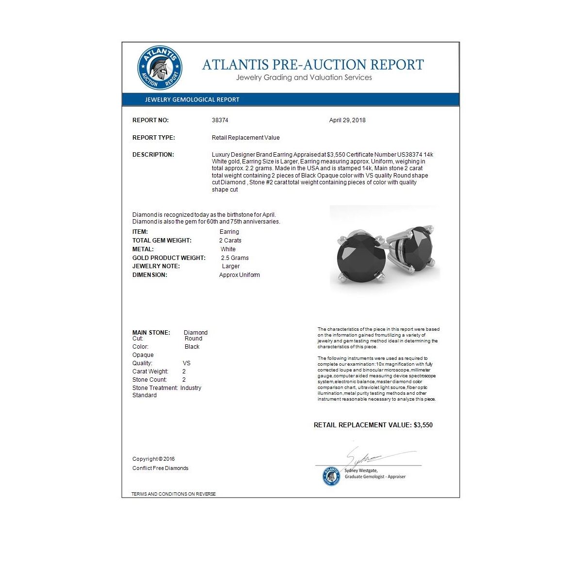 REF-58W4F -38374 ---- 2.0 CTW Black Diamond Stud Designer Earrings 14K White Gold ---- Luxury Designer Brand Earring Appraised at $3,550 Certificate Number US38374 14k White gold, Earring Size is Larger, Earring measuring approx. Uniform, weighing in total approx. 2.2 grams. Made in the USA and is stamped 14k, Main stone 2 carat total weight containing 2 pieces of Black Opaque color with VS quality Round shape cut Diamond , Stone #2 carat total weight containing pieces of color with quality shape cut
