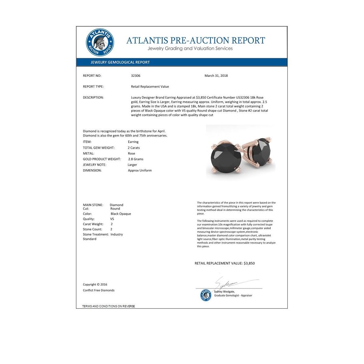 REF-63A8X -32306 ---- 2.0 CTW Black Diamond Stud Designer Earrings 18K Rose Gold ---- Luxury Designer Brand Earring Appraised at $3,850 Certificate Number US32306 18k Rose gold, Earring Size is Larger, Earring measuring approx. Uniform, weighing in total approx. 2.5 grams. Made in the USA and is stamped 18k, Main stone 2 carat total weight containing 2 pieces of Black Opaque color with VS quality Round shape cut Diamond , Stone #2 carat total weight containing pieces of color with quality shape cut