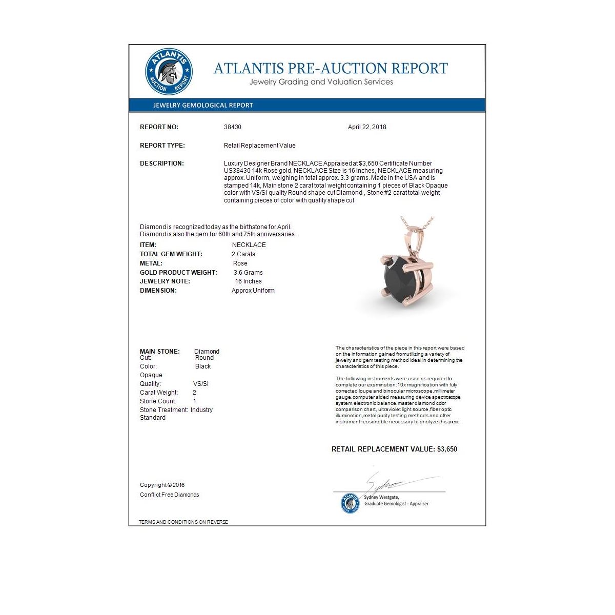 REF-60T4M -38430 ---- 2.0 CTW Black VS/SI Diamond Designer Necklace 14K Rose Gold ---- Luxury Designer Brand NECKLACE Appraised at $3,650 Certificate Number US38430 14k Rose gold, NECKLACE Size is 16 Inches, NECKLACE measuring approx. Uniform, weighing in total approx. 3.3 grams. Made in the USA and is stamped 14k, Main stone 2 carat total weight containing 1 pieces of Black Opaque color with VS/SI quality Round shape cut Diamond , Stone #2 carat total weight containing pieces of color with quality shape cut