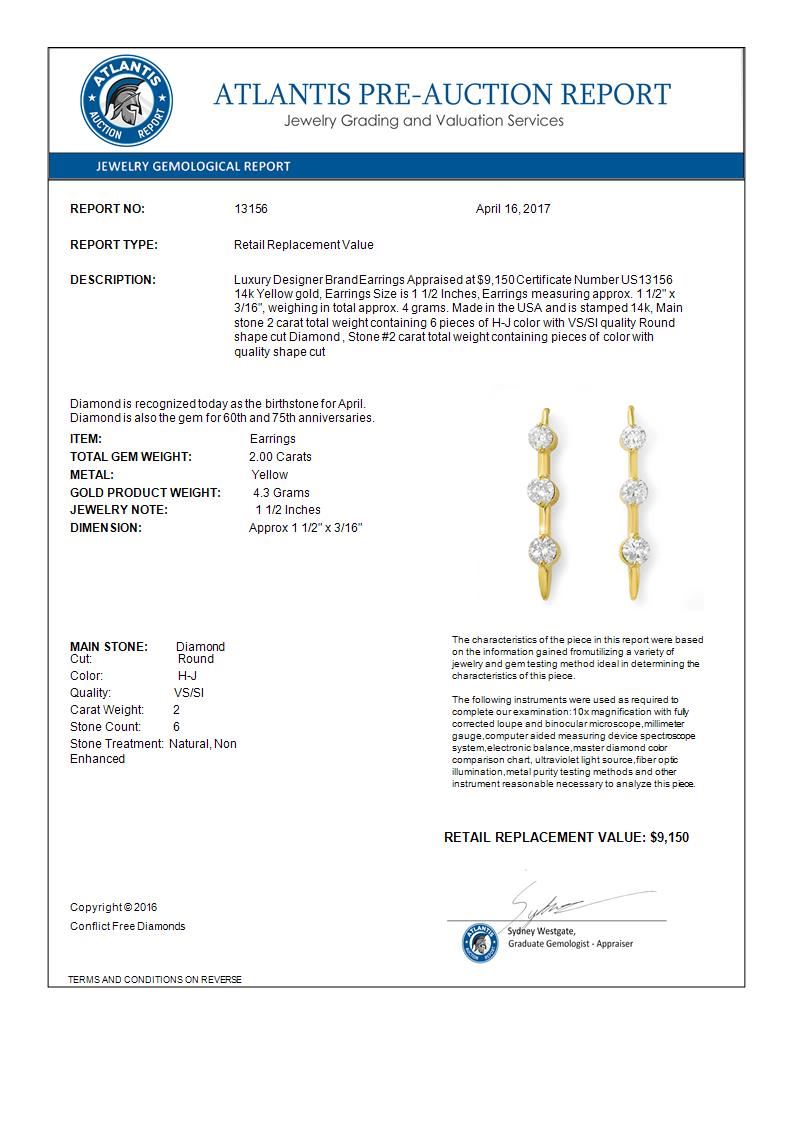 2.0 CTW Certified VS/SI Diamond Earrings 14K Yellow Gold ---- Luxury Designer Brand Earrings Appraised Retail Price at $9,150 ---- SKU Number US13156 14k Yellow gold Earrings Size is 1 1/2 Inches, Earrings measuring approx. 1 1/2" x 3/16", weighing in total approx. 4 grams. Made in the USA and is stamped 14k, Main stone 2 carat total weight containing 6 pieces of H-J color with VS/SI quality Round shape cut Diamond , Stone #2 carat total weight containing pieces of color with quality shape cut