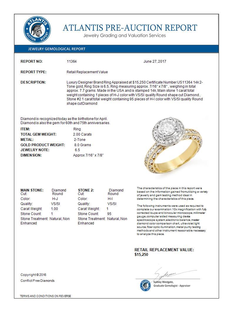 2.0 CTW Certified VS/SI Diamond Ring 14K 2-Tone Gold ---- Luxury Designer Brand Ring Appraised Retail Price at $15,250 ---- SKU Number US11364 14k 2-Tone gold Ring Size is 6.5, Ring measuring approx. 7/16" x 7/8" , weighing in total approx. 7.7 grams. Made in the USA and is stamped 14k, Main stone 1.00 carat total weight containing 1 pieces of H-J color with VS/SI quality Round shape cut Diamond , Stone #2 1 carat total weight containing 95 pieces of H-I color with VS/SI quality Round shape cut