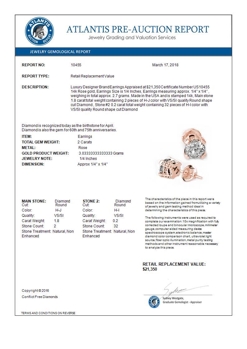 REF-457M2H -10455 ---- 2.0 CTW Certified VS/SI Diamond Solitaire Stud Earrings 14K Rose Gold ---- Luxury Designer Brand Earrings Appraised at $21,350 Certificate Number US10455 14k Rose gold, Earrings Size is 1/4 Inches, Earrings measuring approx. 1/4" x 1/4" , weighing in total approx. 2.7 grams. Made in the USA and is stamped 14k, Main stone 1.8 carat total weight containing 2 pieces of H-J color with VS/SI quality Round shape cut Diamond , Stone #2 0.2 carat total weight containing 32 pieces of H-I color with VS/SI quality Round shape cut Diamond