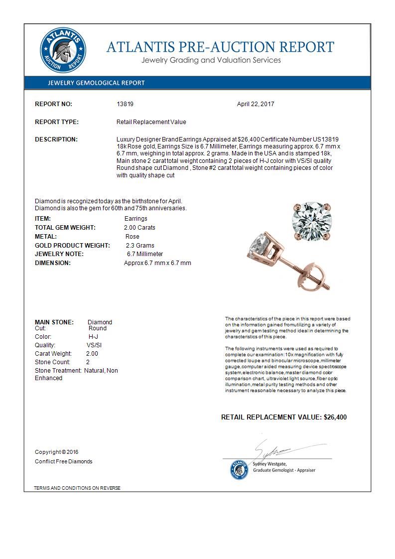 2.0 CTW Certified VS/SI Diamond Solitaire Stud Earrings 18K Rose Gold ---- Luxury Designer Brand Earrings Appraised Retail Price at $26,400 ---- SKU Number US13819 18k Rose gold Earrings Size is 6.7 Millimeter, Earrings measuring approx. 6.7 mm x 6.7 mm, weighing in total approx. 2 grams. Made in the USA and is stamped 18k, Main stone 2.00 carat total weight containing 2 pieces of H-J color with VS/SI quality Round shape cut Diamond , Stone #2 carat total weight containing pieces of color with quality shape cut