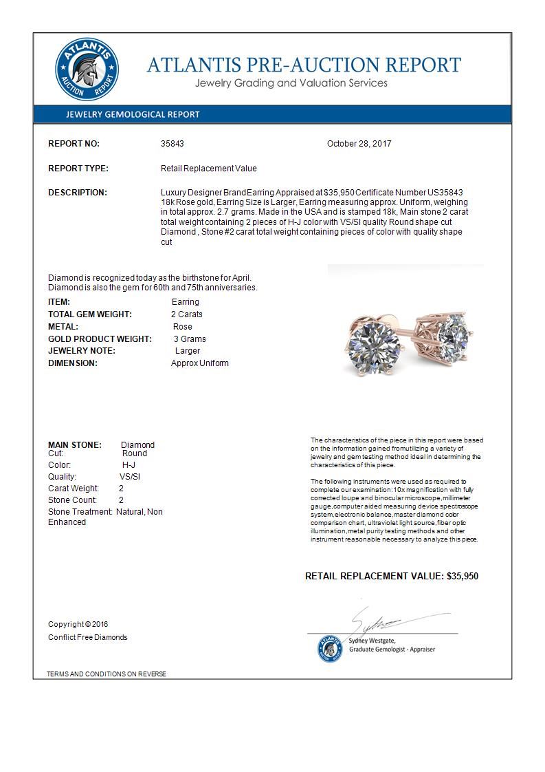 REF-490W4F -35843 ---- 2.0 CTW Certified VS/SI Diamond Stud Solitaire Earrings 18K Rose Gold ---- Luxury Designer Brand Earring Appraised at $35,950 Certificate Number US35843 18k Rose gold, Earring Size is Larger, Earring measuring approx. Uniform, weighing in total approx. 2.7 grams. Made in the USA and is stamped 18k, Main stone 2 carat total weight containing 2 pieces of H-J color with VS/SI quality Round shape cut Diamond , Stone #2 carat total weight containing pieces of color with quality shape cut